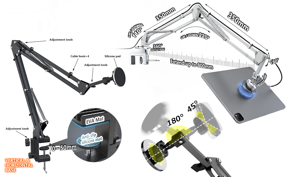 ✹ تعديل متعدد الزوايا - يمكن تدوير الجزء السفلي من حامل الكمبيوتر اللوحي 360 درجة، ويمكن أيضًا تدوير المفصل الكروي بين الذراع وحامل الهاتف المغناطيسي 360 درجة، ويمكن سحب الذراع ذو المفصلين بحرية، لذلك أي زاوية تريد يمكن الوصول إليها.