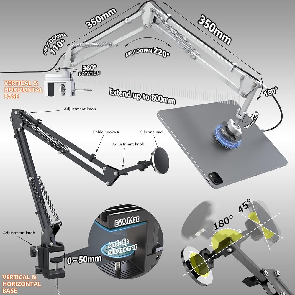 ✹ حامل طاولات بذراع متأرجحة صناعية - أكثر مرونة وقوة من حاملات رقبة الإوز التقليدية، ويمكن سحبها وطيها بحرية لتوفير المساحة.