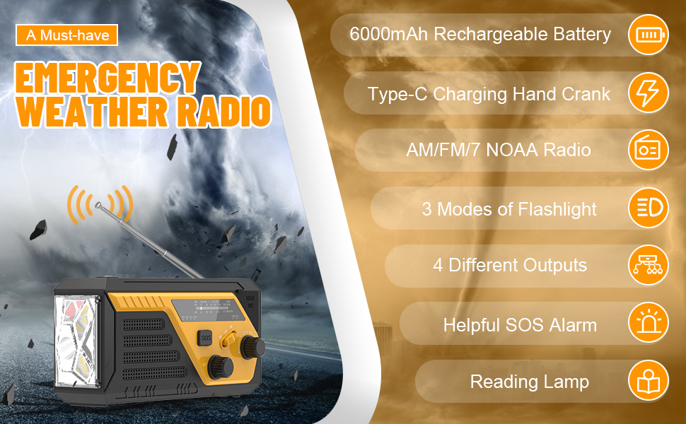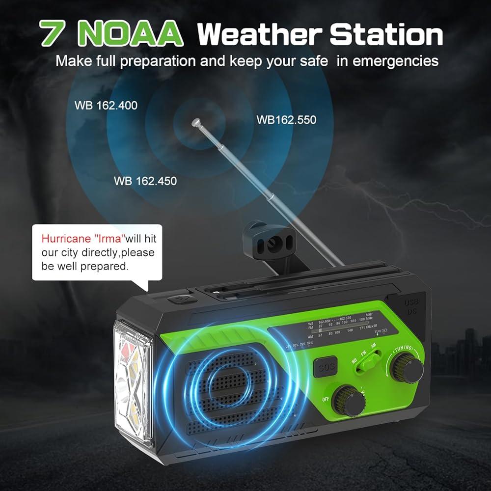 • ✧【راديو الطقس المنقذ للحياة في حالات الطوارئ】هذا الراديو الأحدث بقدرة 6000 مللي أمبير في الساعة ليس مجرد راديو بقاء في حالات الطوارئ يتلقى أحدث معلومات الطقس من 7 محطات NOAA. ولكن أيضًا راديو AM FM يمكنك من خلاله الاستمتاع بإيقاعات الراديو المفضلة. مزود بهوائي مرن للحصول على استقبال جيد حتى في مناطق الإشارة الضعيفة. مع 7 محطات NOAA، وبطارية 6000 مللي أمبير قابلة لإعادة الشحن، ومصباح يدوي للطوارئ، ومنبه SOS، لا داعي للخوف من جميع أنواع حالات الطوارئ.