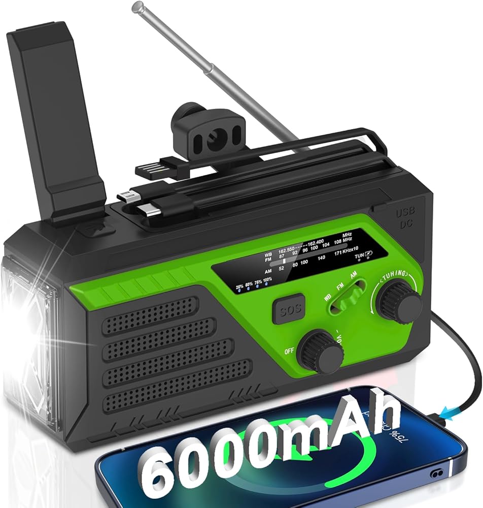 【أحدث 2023】راديو كرنك يدوي للطوارئ بقدرة 6000 مللي أمبير في الساعة، راديو محمول AM FM NOAA للطقس، راديو يعمل بالبطارية مع 4 كابل شحن مدمج، بنك الطاقة، مصباح قراءة مصباح يدوي LED، إنذار SOS للمنزل في حالات الطوارئ
