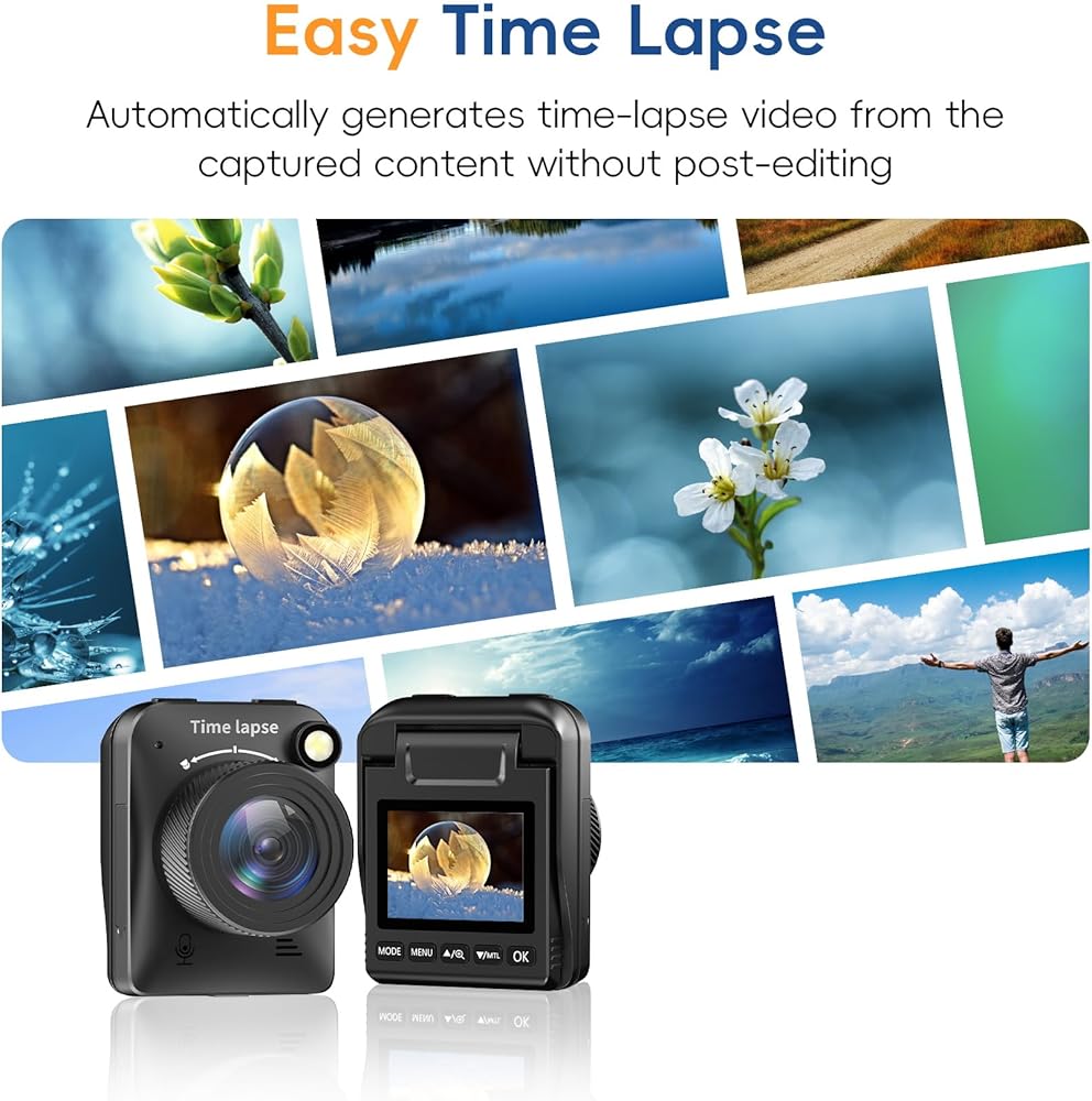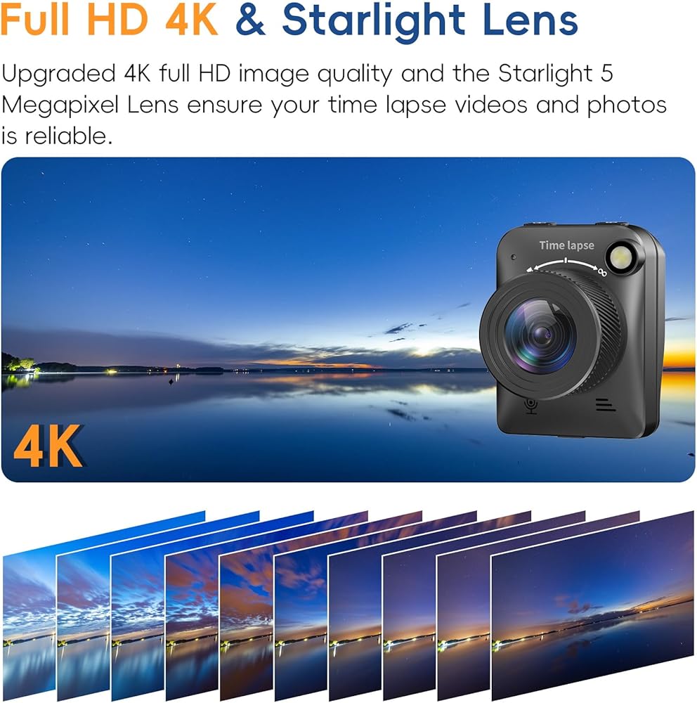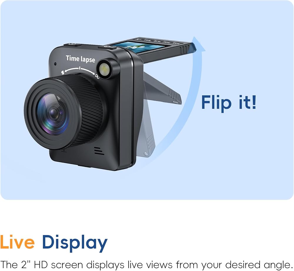 كاميرا قوية 4 كيه تايم لابس بدقة 4 كيه مجهزة بشريحة متقدمة وضوء ملء يمكنها التقاط الصور بوضوح حتى في ظروف الإضاءة المنخفضة. يمكن قلب شاشة IPS بزاوية 90 درجة لضبط الزاوية، وزاوية عرض التصوير أكثر ملاءمة.