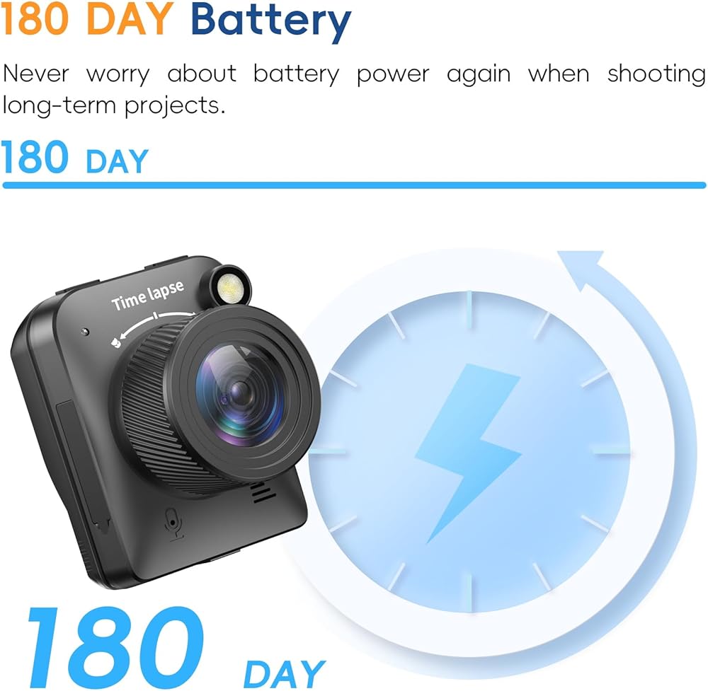 وقت العمل يصل إلى نصف عام، لا تقلق أبدًا بشأن طاقة بطارية الكاميرا عند تصوير المشاريع طويلة الأمد. تدوم البطارية حتى 180 يومًا باستخدام فاصل التقاط لمدة 5 دقائق.