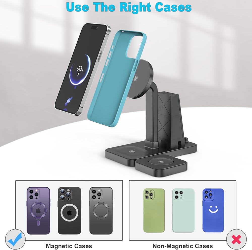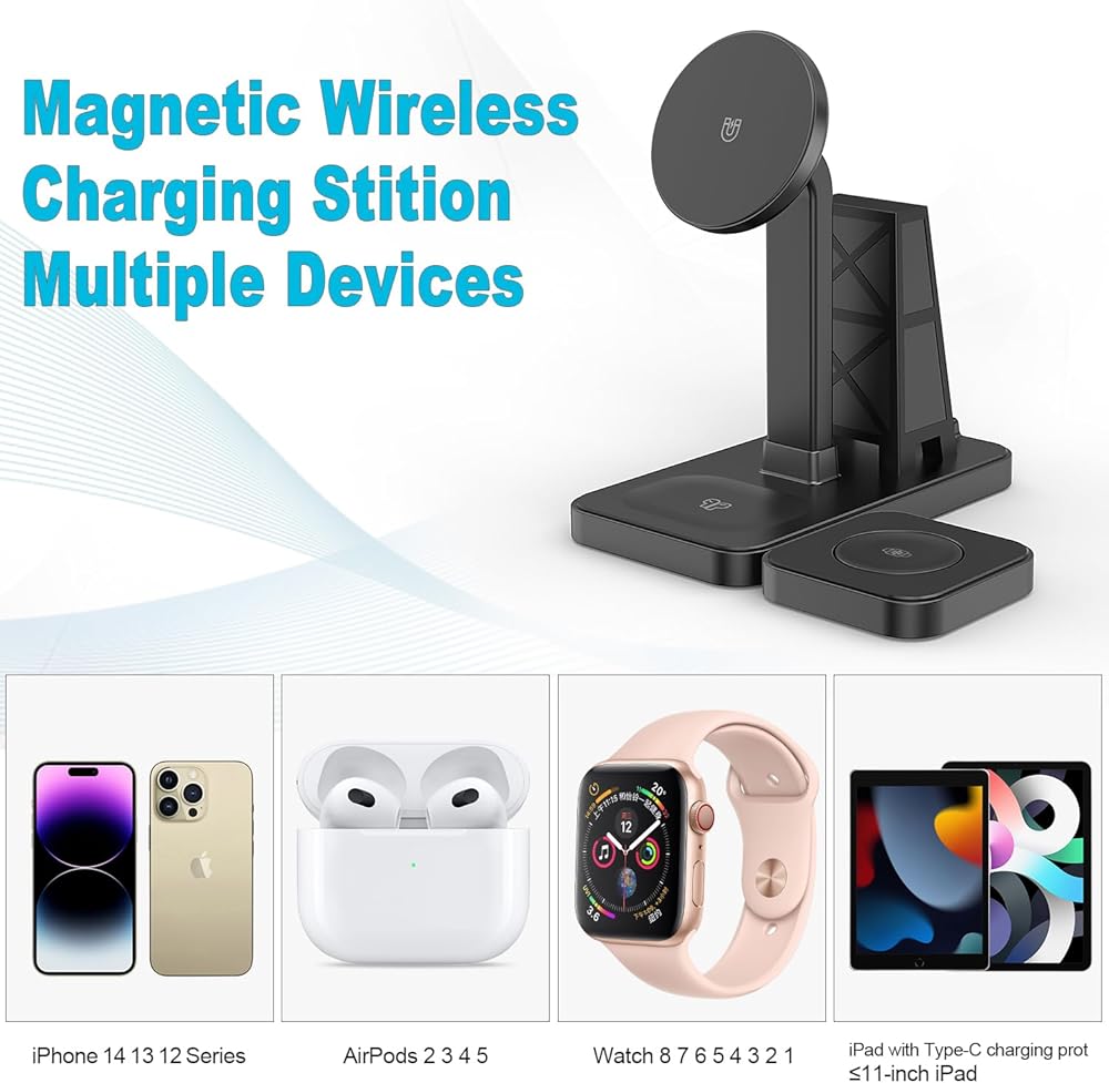 • متوافق للغاية: قاعدة شحن لاسلكية مغناطيسية مثالية 3 في 1 لأجهزة أبل، متوافقة مع ايفون 14/14 برو/14 برو ماكس/13/13 برو/13 برو ماكس/13 ميني/12/12 برو/12 برو ماكس/12 ميني وابل اي ووتش 8 7/6/5/4/3/2/1/اس وايربودز 2/3/4/5 حامل ايباد.