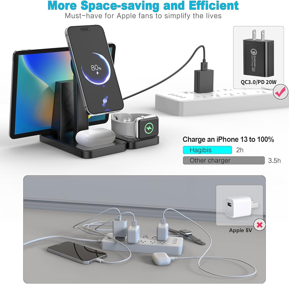 • شاحن لاسلكي مغناطيسي 4 في 1: هذا هو قاعدة شحن للساعة والايربودز والايباد لأجهزة متعددة. متوافق مع قاعدة الشحن اللاسلكية المغناطيسية للأجهزة المتعددة. متوافق مع ايفون 14، 13، 12، حامل ايباد، اي ووتش 8/7/6/5/4/3/2/1، ايربودز 2/3/4/5.