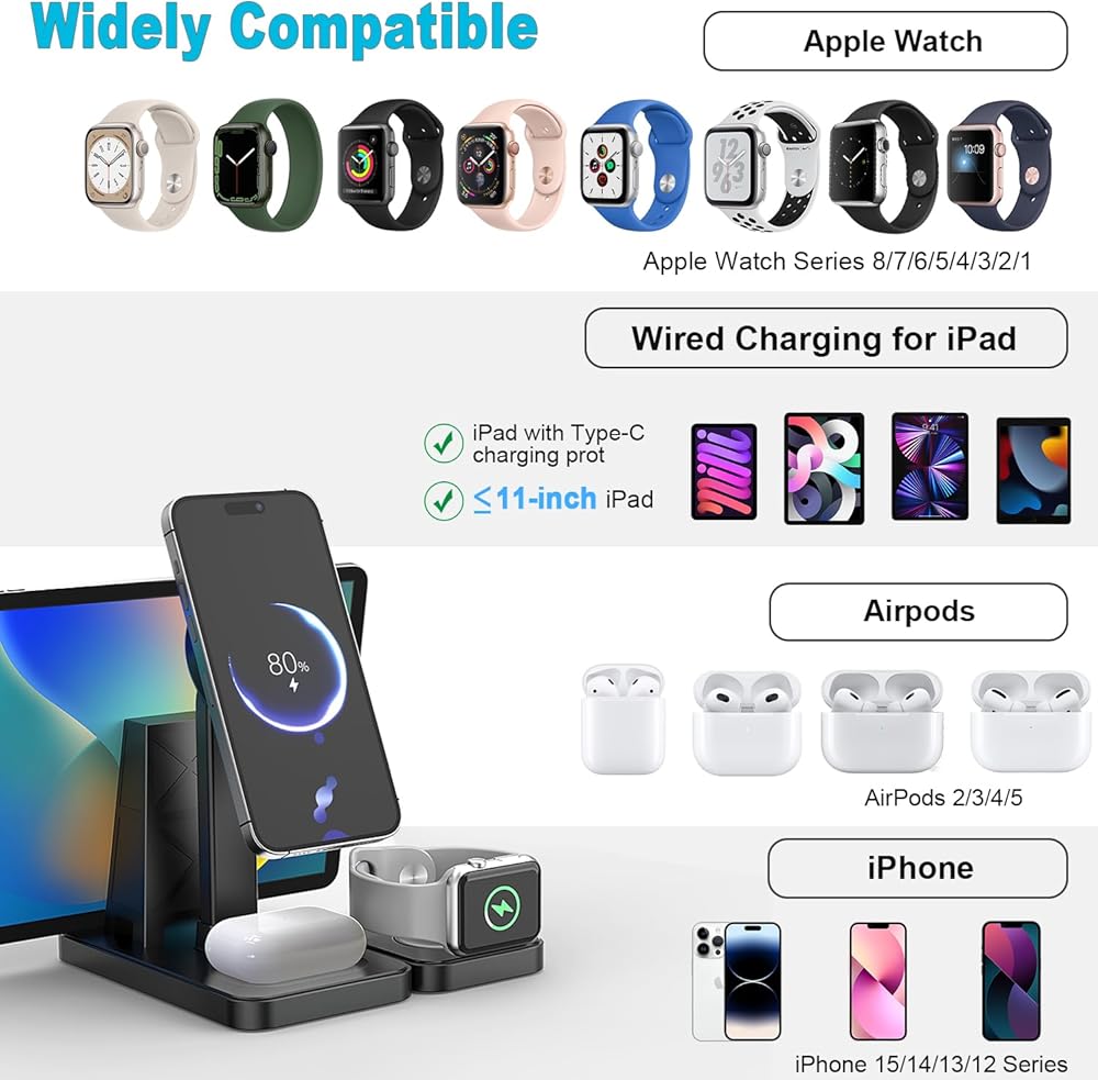قاعدة شحن لاسلكية مغناطيسية لاجهزة متعددة، حامل شاحن سريع 4 في 1 للجوال لمنتجات ابل ايفون 14 13 12، حامل ايباد ووتش 8 7 6 5 4 3 2 1 وايربودز 2 3 4 5