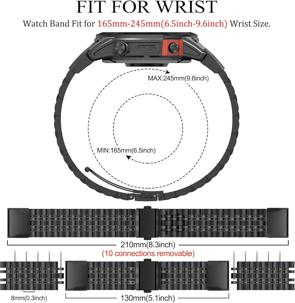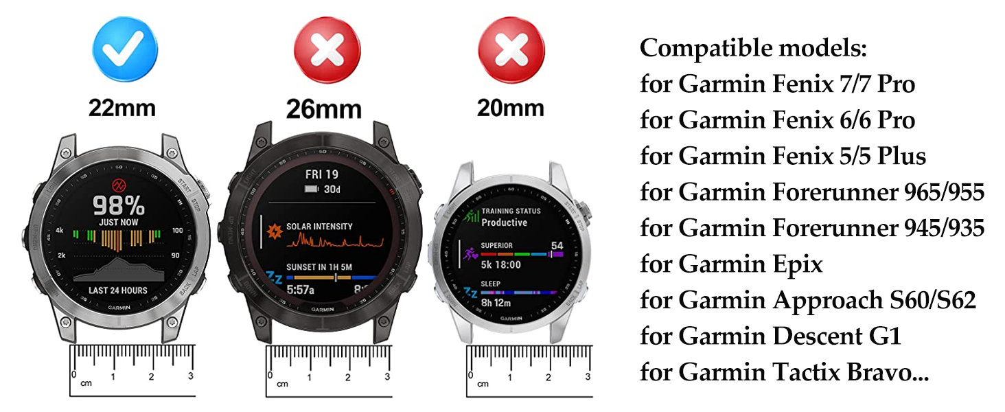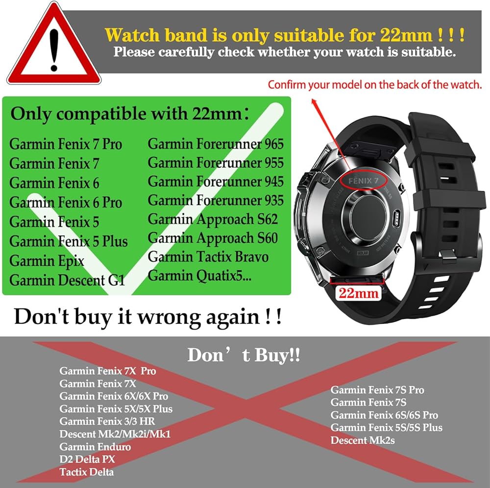 • ⭐[عرض سوار الساعة والتوافق] سوار من الفولاذ المقاوم للصدأ بعرض 22 مم متوافق مع Garmin Fenix ​​7 Pro، Fenix ​​7، Fenix ​​6 Pro، Fenix ​​6، Fenix ​​5 Plus، Fenix ​​5، Forerunner 965، Forerunner 955، Forerunner 945، Forerunner 935، Epix ,Approach S62، Approach S60، Quatix5، Descent G1، Tactix Bravo. ❗❗❗يرجى التأكد من طراز الساعة قبل الشراء، هذا الحزام مناسب فقط لـ garmin 22mm Quickfit.
