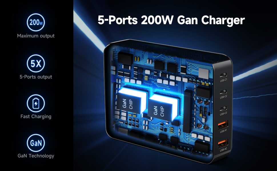 [شاحن USB C عالي الطاقة 200 واط]: تحسين الكفاءة! يستمر منفذ C1 في توفير 100 واط كحد أقصى لشحن أجهزة الكمبيوتر المحمولة بسرعة عالية. عند استخدام 2 من 3 منافذ USB-C معًا فقط، يوفر الشاحن طاقة شحن سريعة تصل إلى 100 واط + 100 واط كحد أقصى لجهازي كمبيوتر محمول في نفس الوقت.