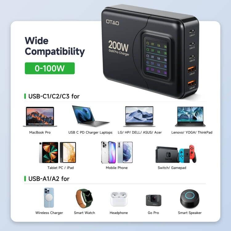 شاحن USB C بقوة 200 وات، شاحن OTAO لسطح المكتب بـ 5 منافذ GaN مع شاشة LCD، PD 3.0 100W/QC 3.0 22.5W/PPS 45W محطة شحن سريعة مع محول تيار متردد لجهاز MacBook Pro/Air، iPad، iPhone، Samsung