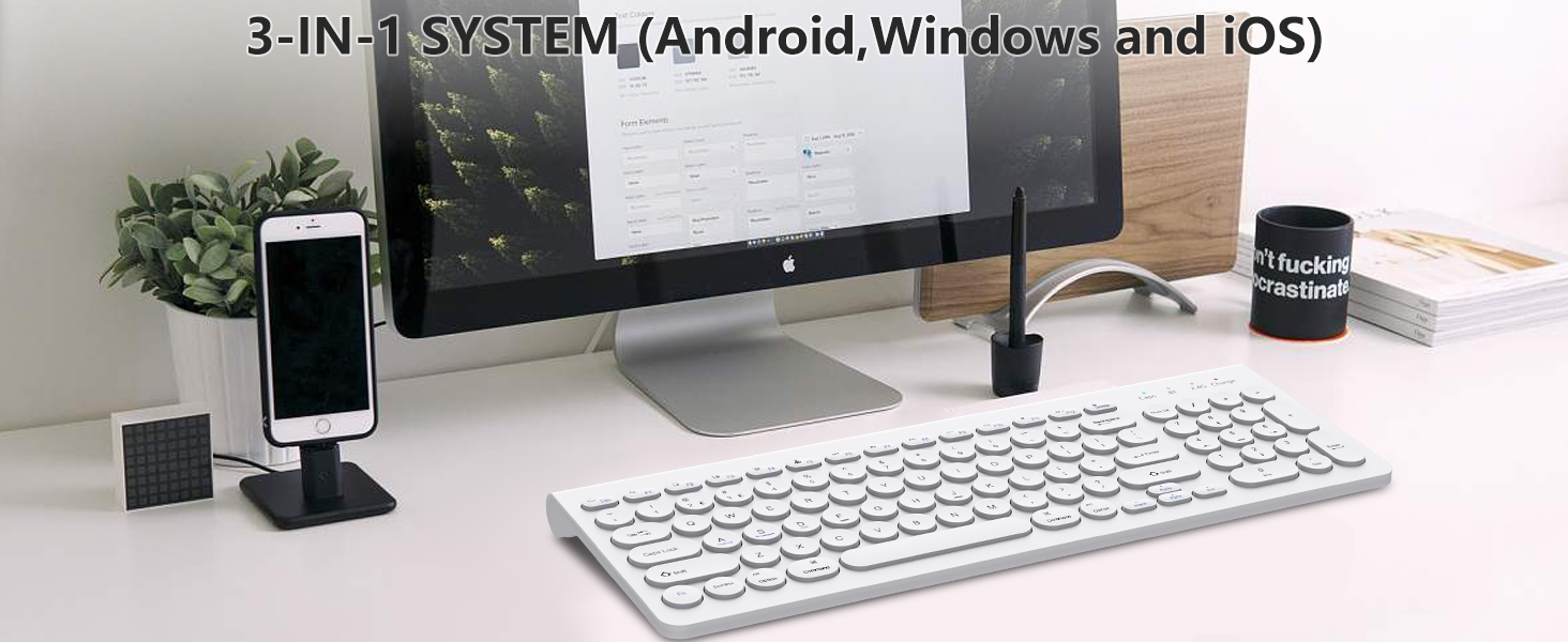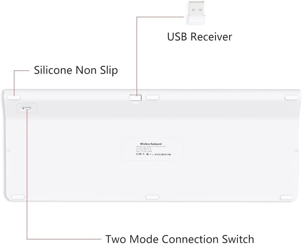 • 【توافق واسع】تعمل لوحة المفاتيح اللاسلكية + البلوتوث ذات الوضع المزدوج بشكل جيد مع ثلاثة أنظمة تشغيل (Android وWindows وIOS). متوافق مع أجهزة الكمبيوتر الشخصية/الكمبيوتر المحمول التي تعمل بنظام Windows، وiMac/Macbook، وiPhone/iPad، والهواتف الذكية/الكمبيوتر اللوحي التي تعمل بنظام Android. يدعم جميع اتصالات البلوتوث والاتصال اللاسلكي USB. (ملاحظة: يتم تخزين جهاز استقبال USB في الجزء الخلفي من لوحة المفاتيح.)