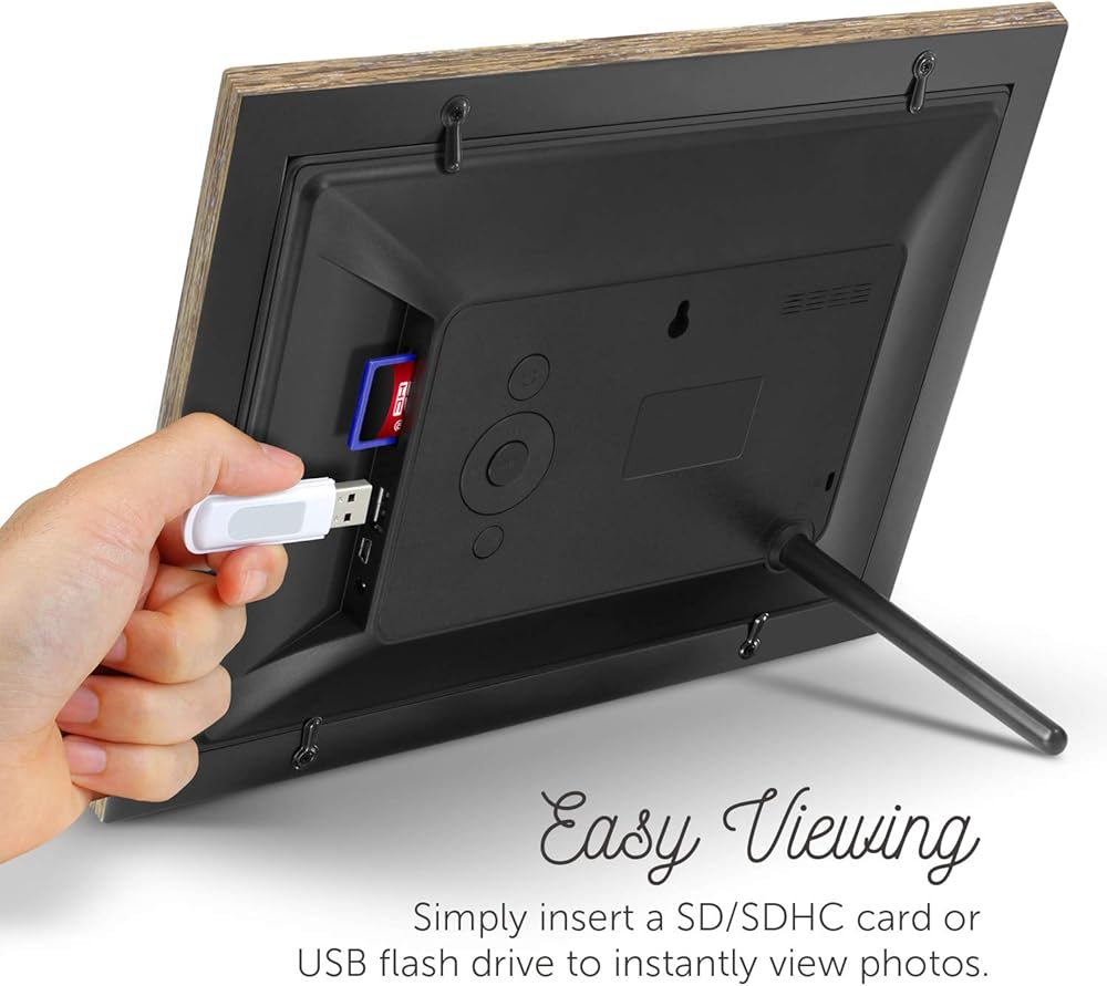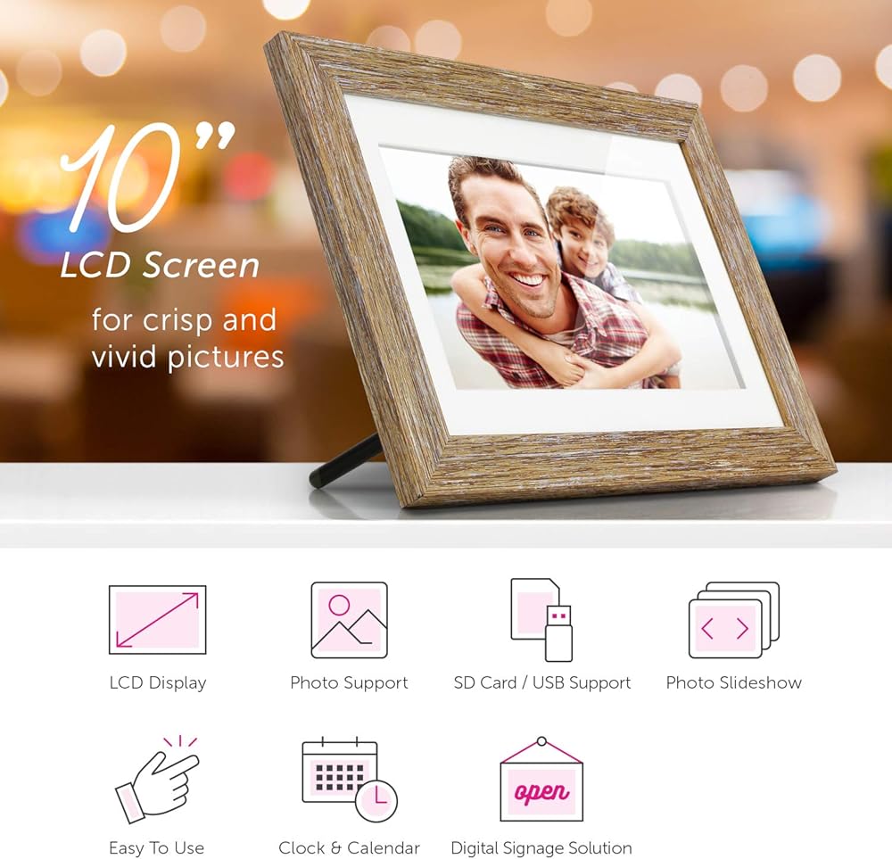 يعد إطار الصور الرقمي الخشبي Aluratek مقاس 10 بوصة طريقة رائعة لإضفاء الحيوية على ذكرياتك الثمينة مع وضوح الصورة المذهل بألوان غنية ونابضة بالحياة على لوحة LCD الملونة الحقيقية بدقة 1024 × 600 بنسبة عرض إلى ارتفاع مثالية 16: 9. يمثل الإطار العملي والأنيق إضافة رائعة لأي غرفة في منزلك أو مكتبك. تعد إطارات الصور الرقمية Aluratek هدية رائعة للأجداد والأمهات وأي شخص يرغب في مشاركة اللحظات التي لا تنسى في عائلتك. اعرض صورًا من أحدث إجازاتك وحفلات التخرج واحتفالات الذكرى السنوية وأعياد الميلاد واسترجعها مرارًا وتكرارًا.