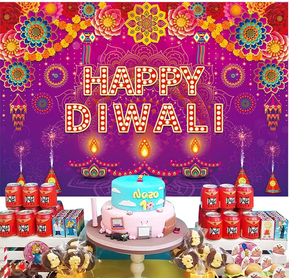 Happy Diwali Theme Design - This Diwali festival decoration is printed with purple and golden yellow Diwali characteristic elements, such as lights, fireworks, kongming lanterns, lanterns to create a strong festive atmosphere for your Diwali party.