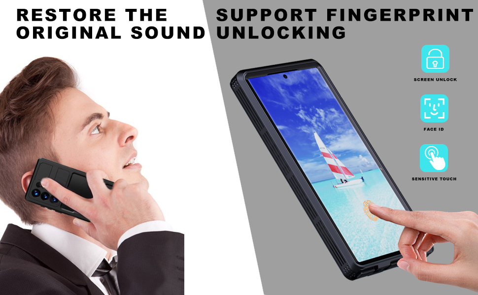 لمسة حساسة وصوت واضح - تحتوي حافظة S23 Ultra المقاومة للماء على واقي شاشة مدمج للحفاظ على حساسية الشاشة مع حمايتها من الخدوش. تم تصميم موضع مكبر الصوت بحفر ثقب + طبقة واقية لضمان مقاومة الماء واستعادة الصوت الأصلي للهاتف.