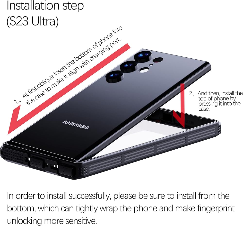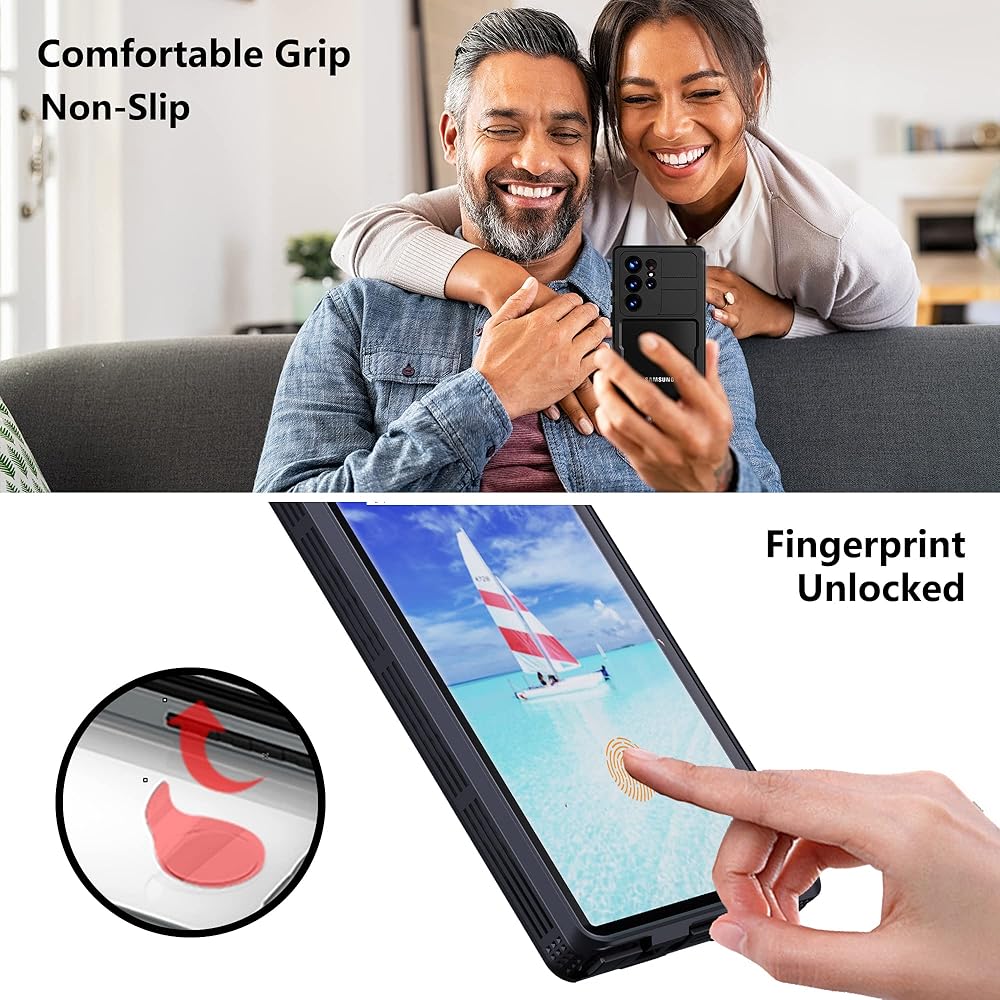 حماية كاملة للجسم - حافظة Samsung Galaxy S23 Ultra عبارة عن تصميم مختوم لكامل الجسم مع واقي شاشة، وحماية العدسة، وحماية الأزرار، وحماية مكبر الصوت، ومكبس منفذ S-Pen، ومكبس منفذ الشحن. حماية 360 درجة لهاتفك المحمول من الماء والغبار والثلج والصدمات والسقوط لا تؤثر على سهولة الاستخدام، ويدعم فتح القفل ببصمة الإصبع، ومعرف الوجه، والشحن اللاسلكي.