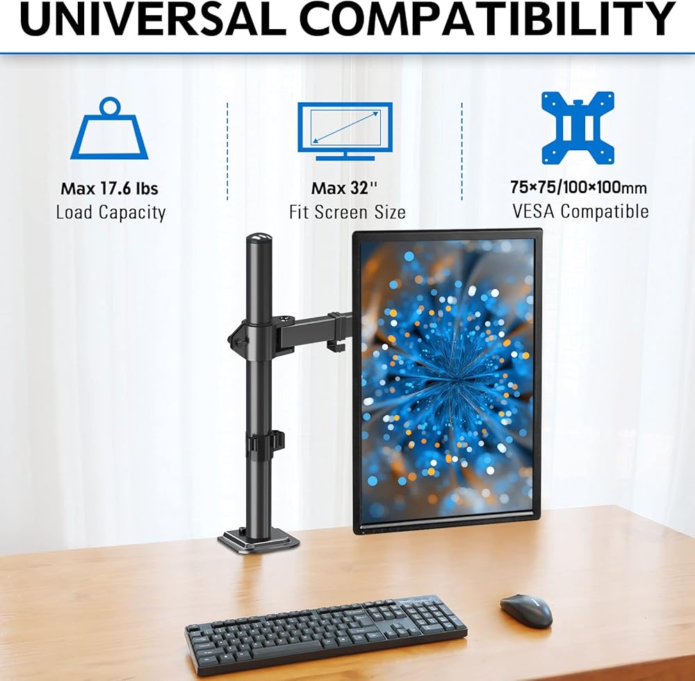 توافق عالمي - تم تصميم حامل الشاشة الفردي لمعظم الشاشات المسطحة مقاس 13 بوصة إلى 32 بوصة وأجهزة الكمبيوتر المنحنية، ويتحمل ما يصل إلى 18.6 باوند، متوافق مع معيار فيسا 75 × 75 ملم و100 × 100 ملم.