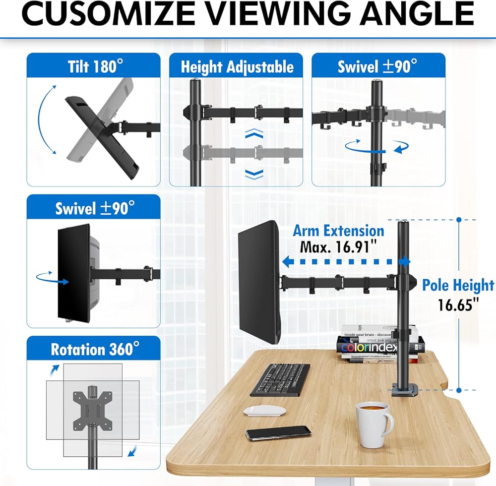 حركة كاملة وتعديل الارتفاع - يسمح حامل الشاشة المكتبي لشاشتك بإمالة 90 درجة وأسفل 90 درجة، دوران 180 درجة، دوران 360 درجة من الأفقي إلى العمودي، وتعديل الارتفاع بسهولة على طول العمود المركزي. يمكن وضعه بعدة طرق مختلفة للعثور على وضع مريح مثالي.