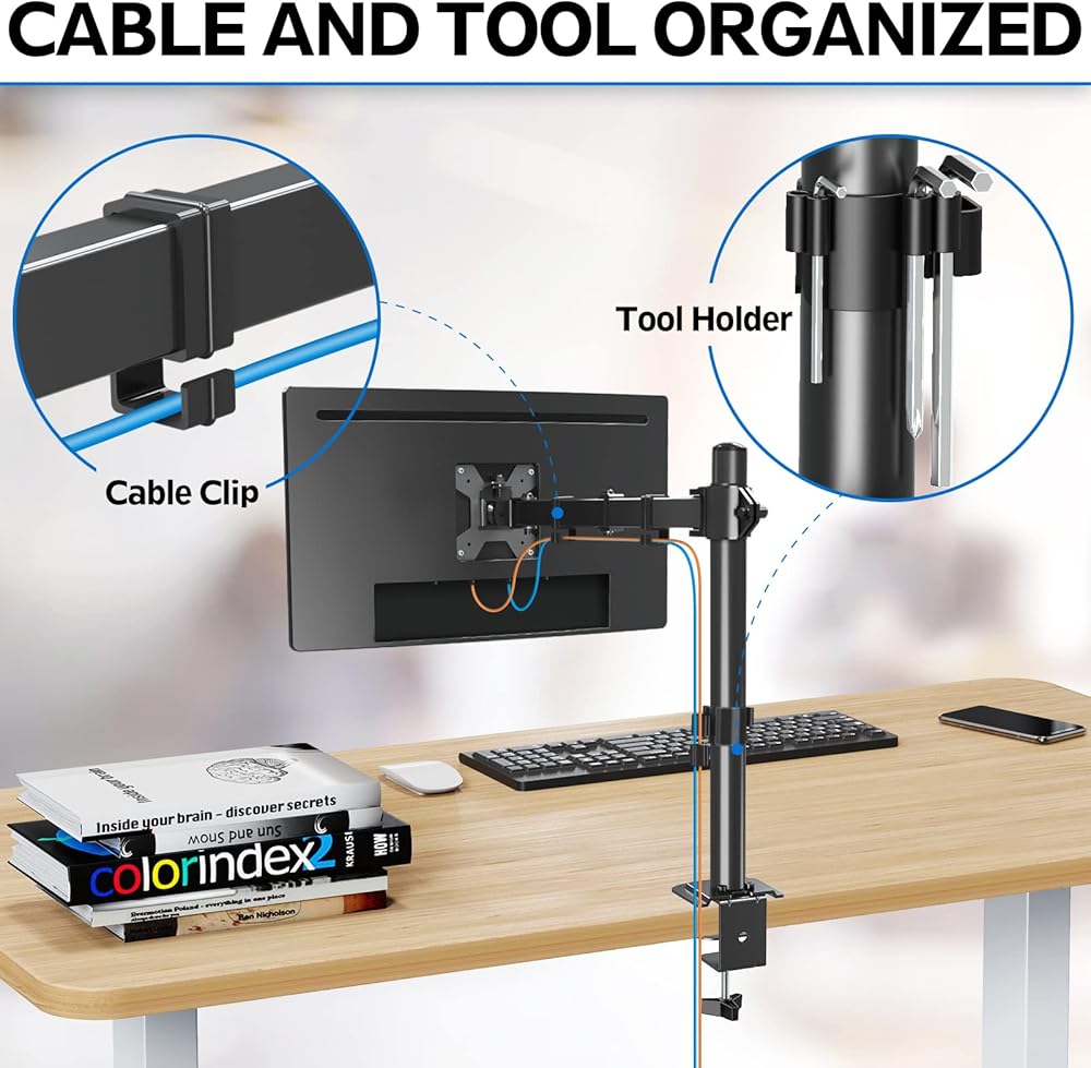 هيكل متين - حامل شاشة كمبيوتر شديد التحمل مصنوع من الستيل الملفوف على البارد يحمل الشاشة بشكل آمن في أي وضع. مشابك الكابلات تحافظ على الأسلاك منظمة ومحمية. يخلق حامل الشاشة الفردي هذا مظهرًا أنيقًا ونظيفًا.
