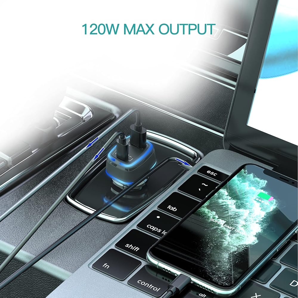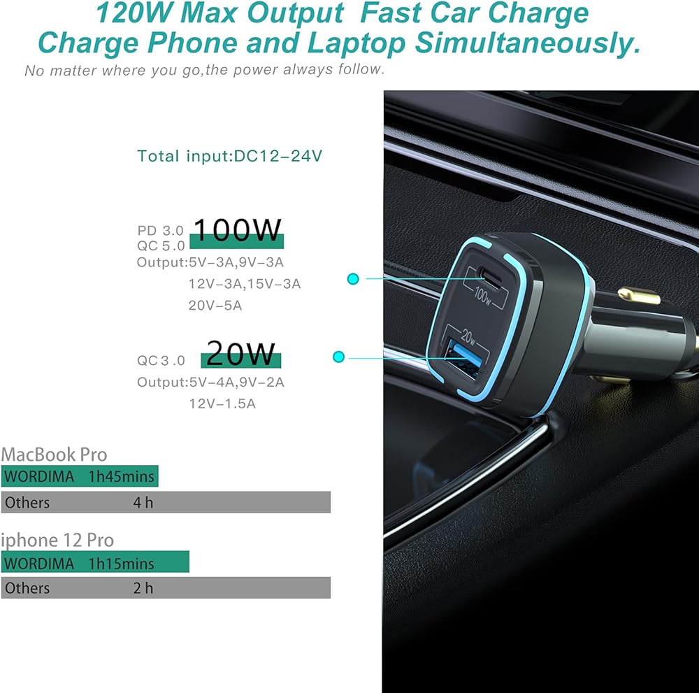 الشحن 0-60% في 30 دقيقة: شاحن سيارة سريع 120 واط يدعم إخراج PD3.0/ QC5.0 100 واط وQC3.0 20 واط مما يسمح بشحن جميع أجهزتك بسرعة على الطريق. مخرج منفذ PD: 5V-3A، 9V-3A، 12V-3A، 15V-3A، 20V-5A؛ مخرج منفذ USB: 5V-4A، 9V-2A، 12V-1.5A.