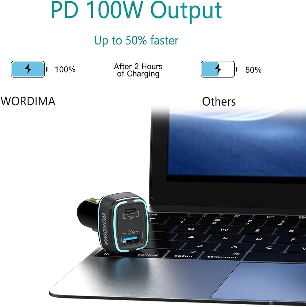 شاحن سيارة للكمبيوتر المحمول بقوة فائقة: يعد محول السيارة للشحن السريع WORDIMA PD100W توصية ممتازة لشحن أسرع لأجهزة الكمبيوتر المحمولة المزودة بمنفذ PD. خذ هذا، يمكنك شحن الكمبيوتر المحمول الخاص بك بشكل عاجل عند الخروج. انتبه: يرجى استخدام الكابل مع شريحة العلامة الإلكترونية لـ عملية 100 واط