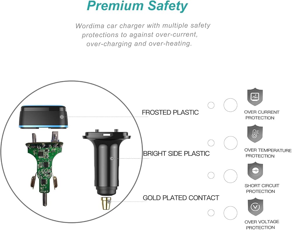 أمان متعدد: شاحن سيارة WORDIMA USB C مع شهادات CE وFCC وROHS. حماية أمان متعددة ضد التيار الزائد والشحن الزائد والسخونة الزائدة. نحن نقدم حماية كاملة لك ولأجهزتك. * ضمان المنتج لمدة 12 شهرًا بدون قلق وخدمة عملاء صديقة مدى الحياة.