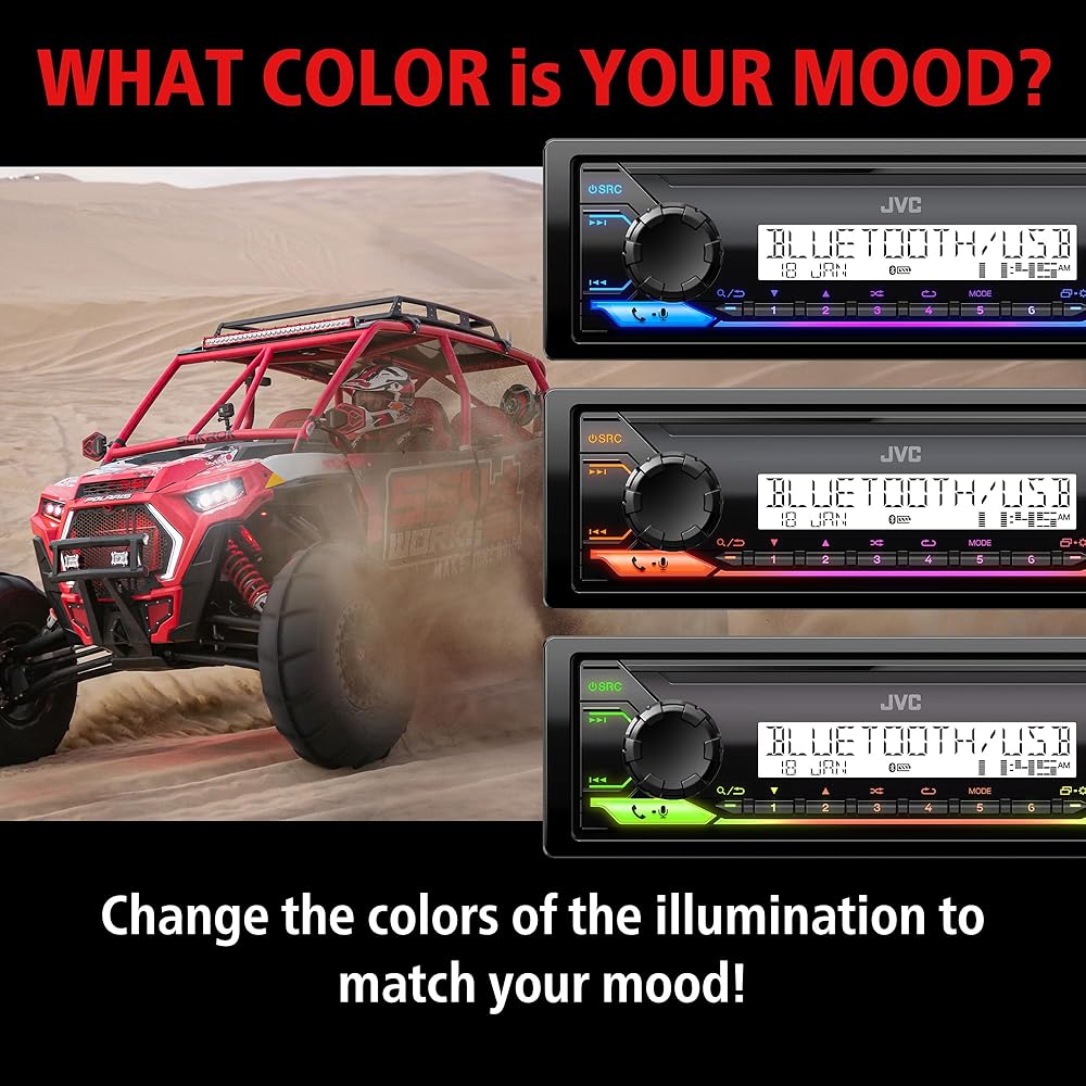 Introducing the ultimate audio solution for your on-the-go lifestyle - The JVC multi-vehicle car stereo has a powerful amplifier and variable color display! Designed to work in a car, boat, ATV, and golf cart, this versatile system is built to handle it all. Featuring a rugged backlit volume knob and a bright backlit display that can be easily seen in direct sunlight, this car stereo is designed to withstand the elements and provide an optimal listening experience no matter where you go. With a variety of connectivity options, including Bluetooth, USB, and AUX, you can easily stream your favorite tunes from your phone or other devices. The easy-to-use interface and intuitive controls make it a breeze to navigate your music, adjust the volume, and switch between sources. Plus, the customizable color display allows you to personalize your listening experience to match your style and mood. Whether you're hitting the open road, the trails, or the waves, the multi-vehicle car stereo is the perfect choice for anyone who loves to enjoy their music on the go. Upgrade your ride today and never miss a beat!.