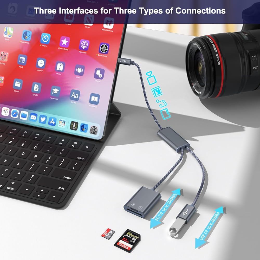 📱 سريع وخالي من المتاعب --- باستخدام قارئ بطاقة SD هذا، يمكنك بسهولة نقل الصور ومقاطع الفيديو بين الأجهزة المختلفة. سواء كنت تريد نقل الملفات من الكاميرا إلى هاتفك أو مشاركة ملفات الوسائط على جهاز MacBook الخاص بك، فإن هذا القارئ يبسط العملية.