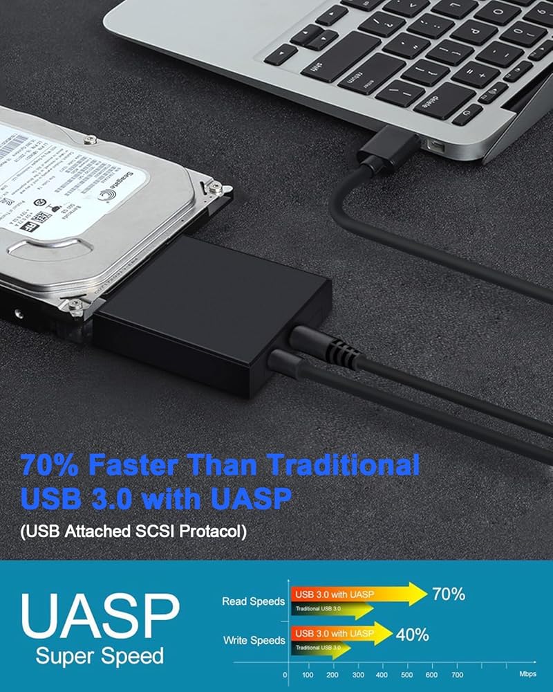 • سرعات نقل سريعة: يدعم محول ساتا إلى USB سرعات نقل بيانات USB 3.0 التي تصل إلى 5 جيجابايت في الثانية. يسمح لك بنقل الأفلام أو الملفات عالية الدقة في ثوانٍ معدودة. متوافق مع الإصدارات السابقة مع منافذ USB 2.0 أو 1.1.
