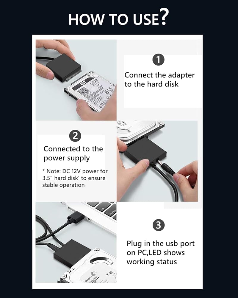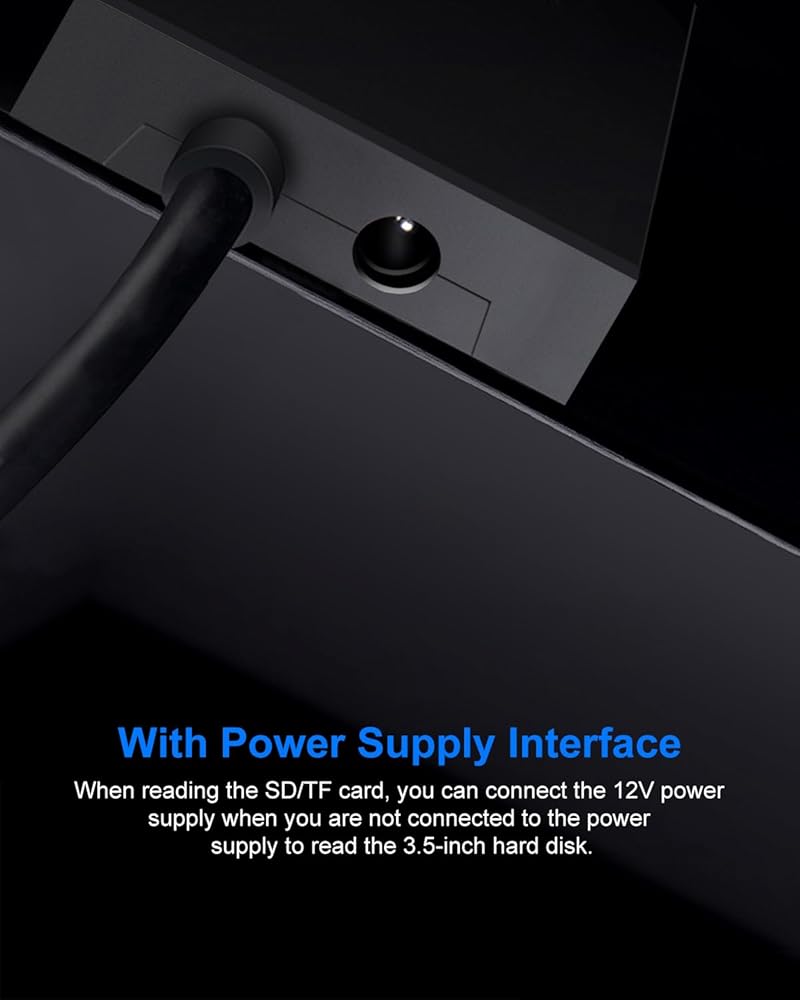 • محول طاقة 12 فولت 2 أمبير متضمن: كابل موصل USB 3.0 إلى ساتا مجهز بمصدر طاقة تيار مستمر، والذي يمكن أن يوفر طاقة كافية. يمكن توصيل كل من قرص صلب ساتا مقاس 2.5 انش أو 3.5 انش. يرجى ملاحظة أن مصدر الطاقة مطلوب بالضرورة إذا كان قرص صلب ساتا 3.5 انش متصلاً.