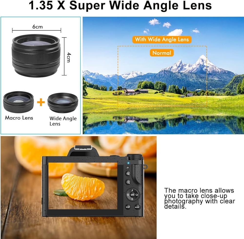 【عدسة زاوية واسعة وعدسة ماكرو ومصباح يدوي】 كاميرا الفيديو 4K مجهزة بعدسة زاوية واسعة احترافية قابلة للفصل مقاس 58 مم وعدسة ماكرو. عدسة ذات زاوية واسعة تصل إلى 118 درجة. وهو مثالي لتصوير المباني الكبيرة والمناظر الطبيعية الخارجية. تعد عدسة الماكرو مساعدة كبيرة إذا كنت تريد التقاط صور قريبة بتفاصيل حادة مثل الزهور والحشرات. يساعدك ضوء التعبئة المدمج على التقاط صور عالية الجودة في الظلام.