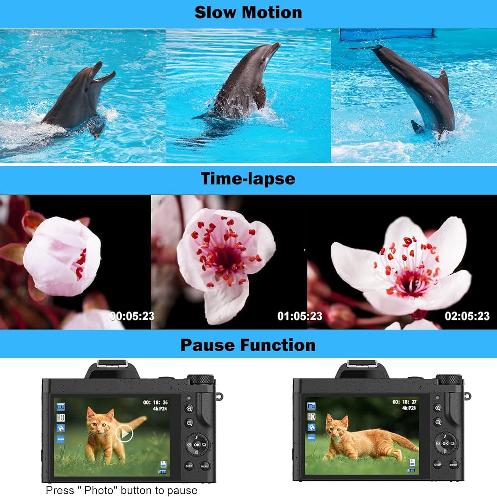 【وظيفة إخراج وإيقاف مؤقت لكاميرا الويب وHDMI】 يمكن استخدام كاميرا الفيديو ككاميرا ويب، ويمكنك إجراء مكالمات فيديو أو بدء البث المباشر لمشاركة الأشياء على وسائل التواصل الاجتماعي. يمكنك توصيل كاميرا الفيديو هذه بالتلفزيون عبر كابل HDMI لتشغيل الصور ومقاطع الفيديو. (يتضمن كابل HDMI). تتمتع الكاميرا الرقمية بدقة 4K بوظيفة إيقاف مؤقت ممتازة تسمح لك بمواصلة التسجيل في نفس الملف دون إعادة تشغيل ملف جديد.