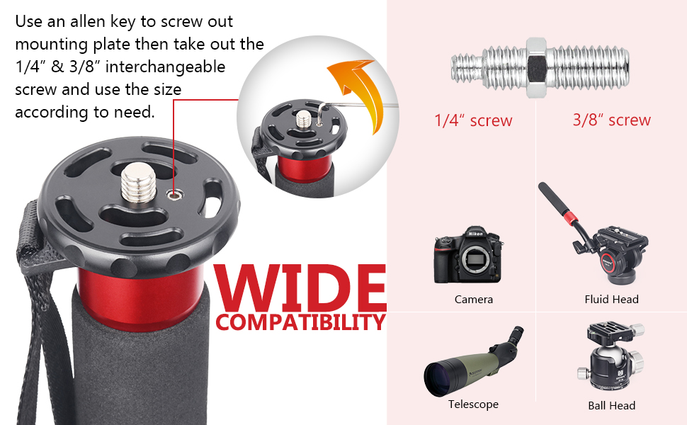 ✔برغي قابل للتبديل: استخدم مفتاح ألن لفك لوحة التثبيت ثم أخرج المسمار القابل للتبديل 1/4 بوصة و3/8 بوصة واستخدم الحجم حسب الحاجة. يمكن تركيب برغي 3/8 بوصة برأس كروي أو رأس سائل، ويمكن لبرغي 1/4 بوصة توصيل الكاميرا أو التلسكوب مباشرة.