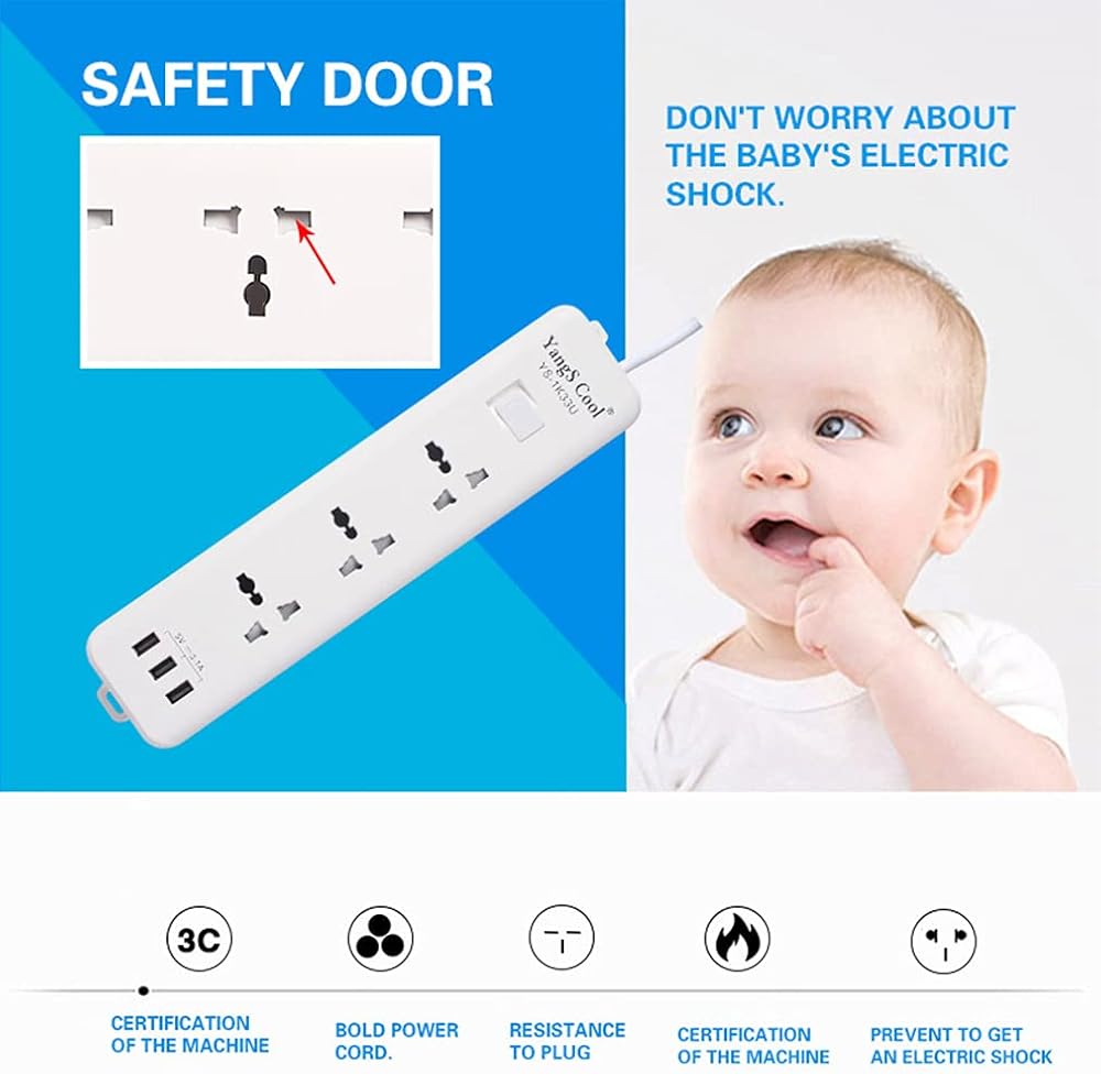 2 منافذ تيار متردد محمية من ارتفاع التيار المتردد، منافذ متباعدة 2.1 بوصة مصممة لاستيعاب المحولات الكهربائية أو المقابس كبيرة الحجم. تصميم باب آمن للأطفال يمنع الصدمات الكهربائية للطفل