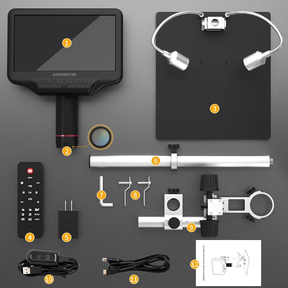 【ما ستحصل عليه】مجهر × 1، فلتر الأشعة فوق البنفسجية (مجمع)، 1 × قاعدة معدنية، 1 × عمود معدني، 1 × شعاع، 1 × مفتاح ربط، 1 × مشابك معدنية، 1 × جهاز تحكم عن بعد، 1 × كابل التبديل، 1 × كابل HDMI، 1 × قابس طاقة، 1 × تعليمات.