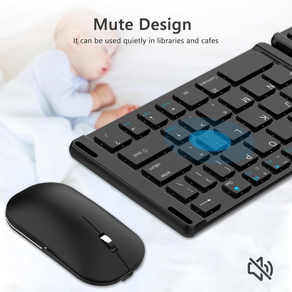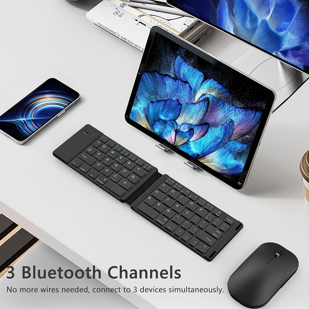 مجموعة لوحة مفاتيح وماوس قابلة للطي: تأتي لوحة المفاتيح اللاسلكية مع 3 قنوات بلوتوث، مما يسمح لك بتوصيل 3 أجهزة في نفس الوقت. يمكن توصيل الماوس اللاسلكي باستخدام Bluetooth أو دونجل USB بسرعة 2.4 جيجا هرتز. يتوافق كل من لوحة المفاتيح والماوس مع الأجهزة الإلكترونية التي تدعم اتصالات Bluetooth 5.0 و3.0.