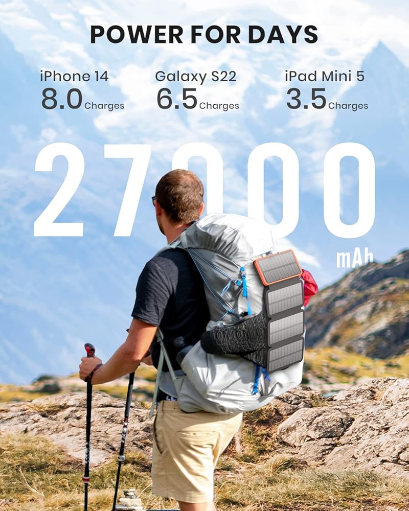 الطاقة لعدة أيام: يتميز الشاحن الشمسي بسعة هائلة تبلغ 27000 مللي أمبير في الساعة، مما يسمح لك بشحن هاتفك لمدة 6-8 مرات قبل الحاجة إلى إعادة شحن بنك الطاقة نفسه.