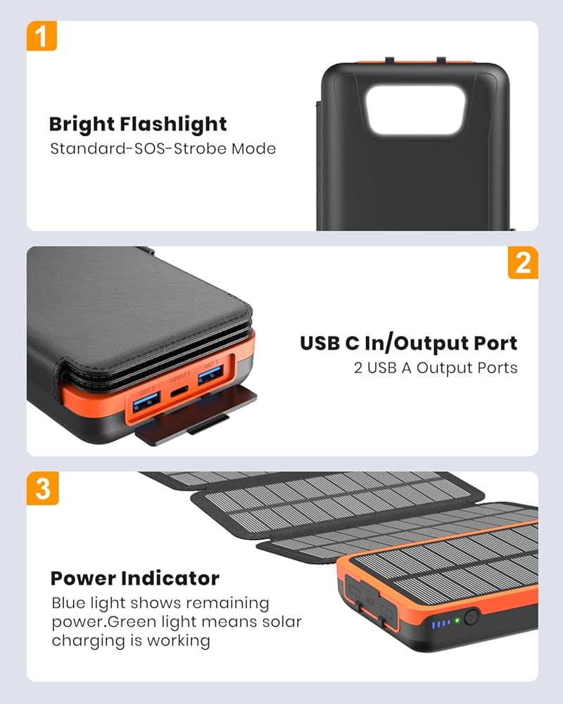 الشحن بالطاقة الشمسية: مزود بـ 4 ألواح شمسية وقادرة على توليد ما يصل إلى 6 وات من الطاقة في ضوء الشمس المباشر، يوفر بنك الطاقة الشمسية مصدرًا موثوقًا للطاقة لإعادة شحن أجهزتك عندما تكون خارج الشبكة.