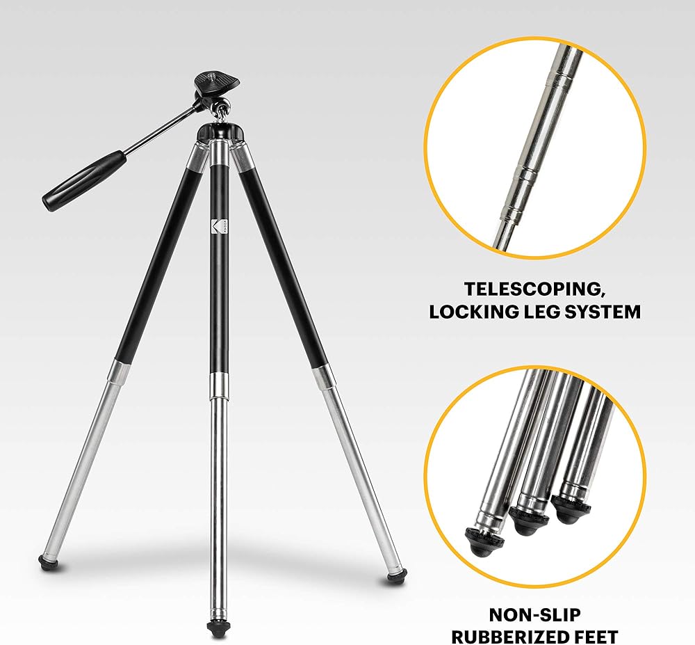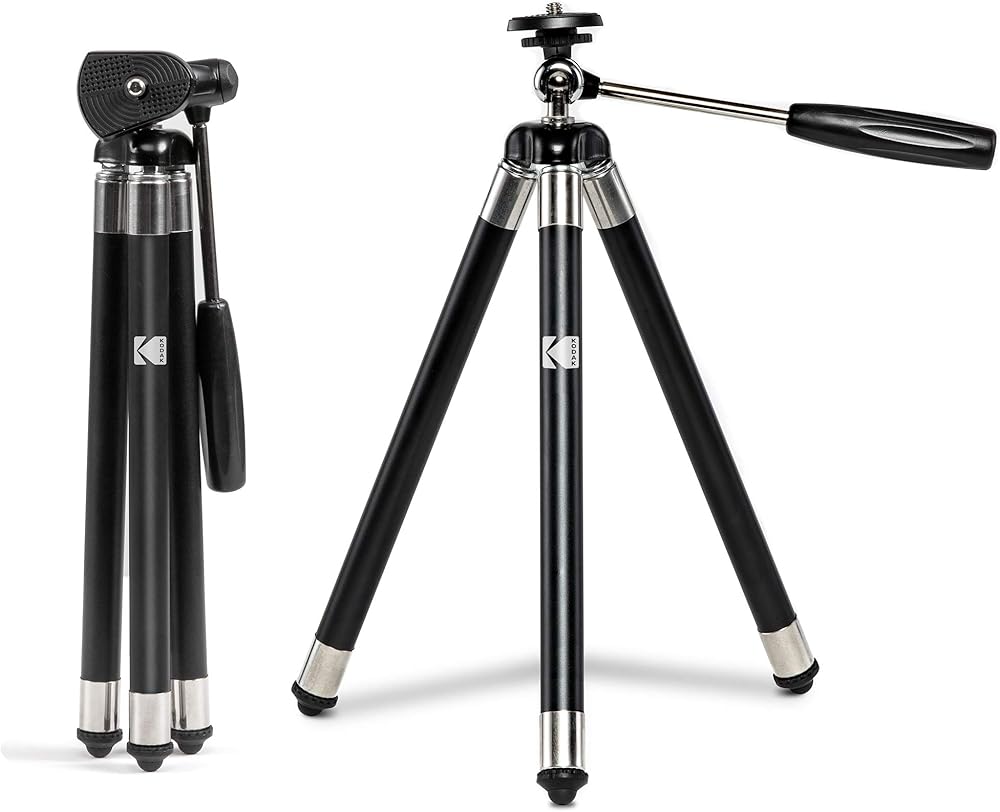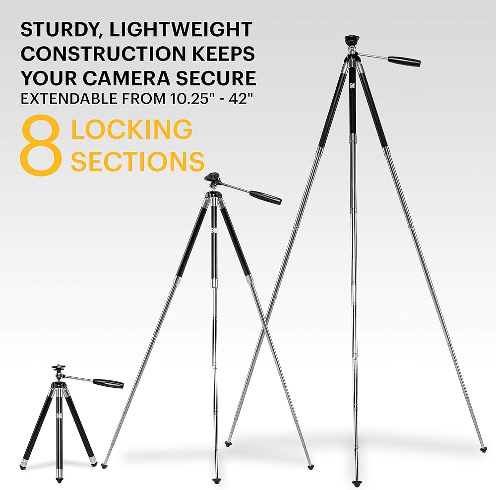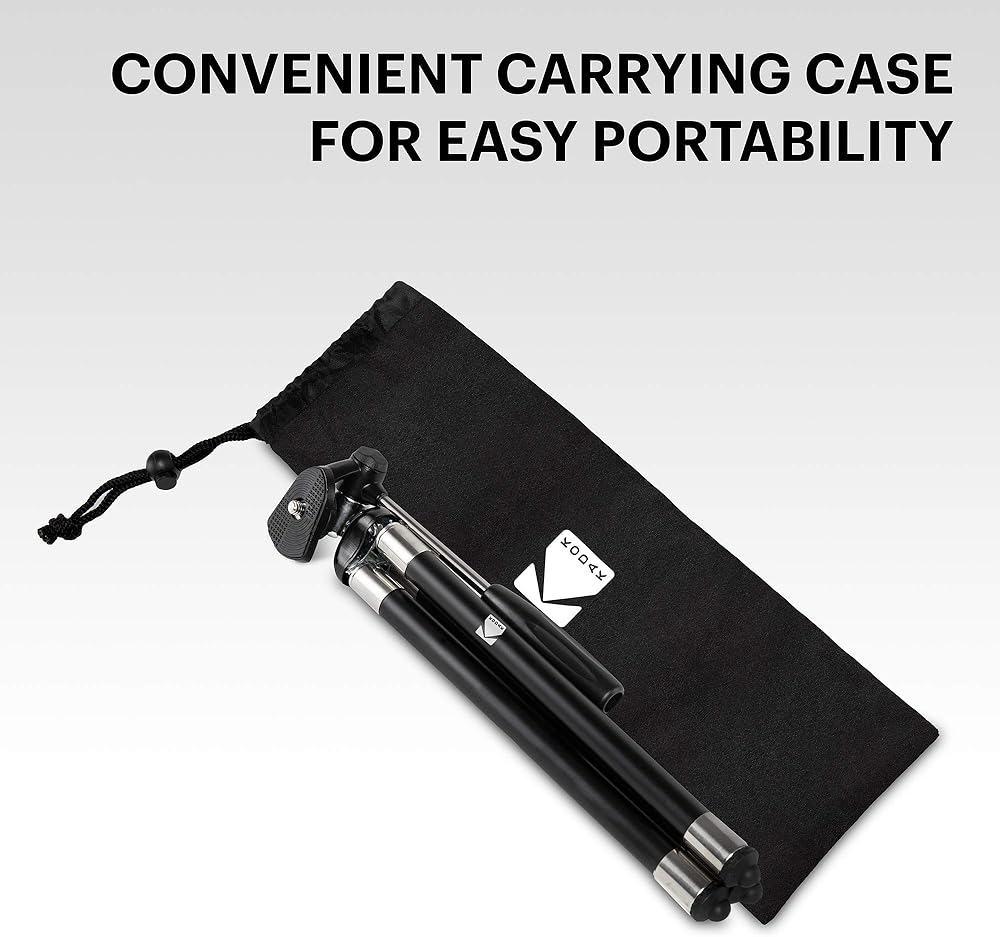 حامل ثلاثي KODAK PhotoGear مقاس 42 بوصة | حامل ثلاثي من الألومنيوم من الفولاذ المقاوم للصدأ مكون من 8 أقسام مع جهاز تحكم عن بعد يعمل بالبلوتوث، تعديل ارتفاع قفل الساق، رأس كروي 360 درجة، أقدام مطاطية، دليل إلكتروني لمحول الهاتف الذكي وحقيبة حمل