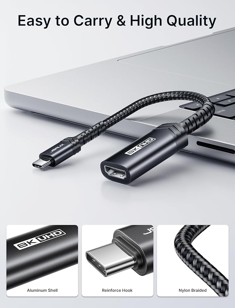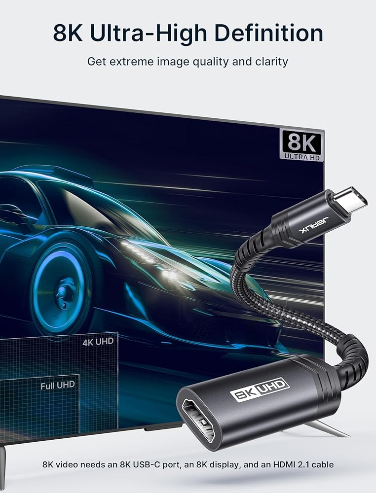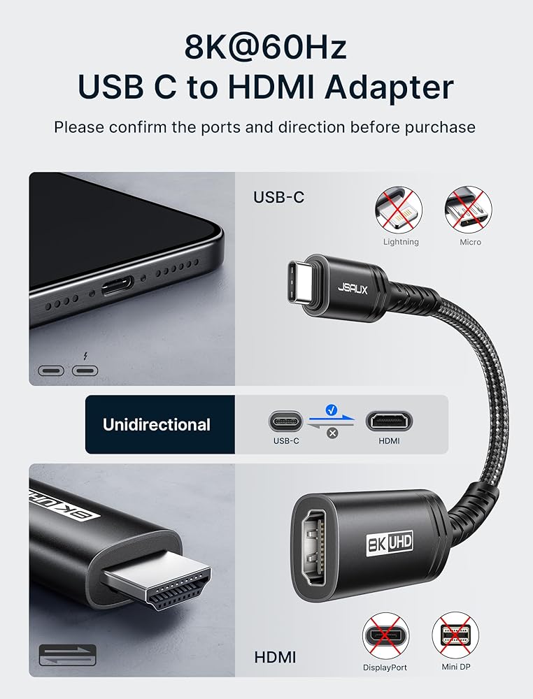• 【ما تحصل عليه: سوف تحصل على محول JSAUX 8K USB C إلى HDMI، والذي يشاهد على الشاشة الكبيرة في أي وقت دون القلق بشأن مشكلات صب واي فاي. (*ملاحظة: مصمم لأجهزة الكمبيوتر بشكل أساسي، ولا يحتوي على أي منفذ شحن على المحول)