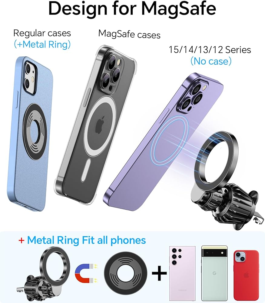 ✅【قابلية تكيف واسعة】: يمكن وضع حامل السيارة المغناطيسي مباشرة على iPhone 15، 15 Pro، 15 Pro Max، 15 Plus، 14، 14 Pro، 14 Pro Max، 14 Plus، iPhone 13، 13 Pro، 13 Pro Max، توجد حافظات 13 Mini وiPhone 12 و12 Pro و12 Pro Max و12 Mini وMagsafe. ملحوظة: الحلقة المعدنية المرفقة مطلوبة إذا تم استخدامها مع موديلات الهواتف الأخرى أو حافظات غير MagSafe!