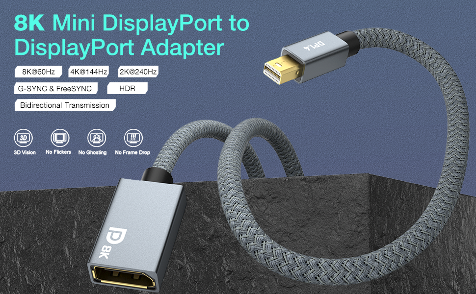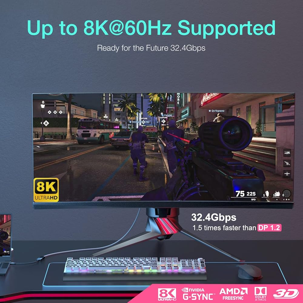 • 【ميزات الألعاب الاحترافية】 يمكن لمحول Mini DisplayPort 1.4 نقل الصور بحد أقصى 8K@60هرتز، و4K@144هرتز، و2K@240هرتز، و1080P@240هرتز بسهولة إلى شاشة متميزة مع وظيفة DSC 1.2a المتقدمة. تتيح لك تقنيات مزامنة الإطارات AMD FreeSync وNVIDIA G-Sync عدم القلق مطلقًا بشأن تأثيرات "التقطيع". يعمل معدل التحديث الأعلى على تقليل الوميض ليمنحك لقطات سلسة ومستقرة داخل اللعبة.