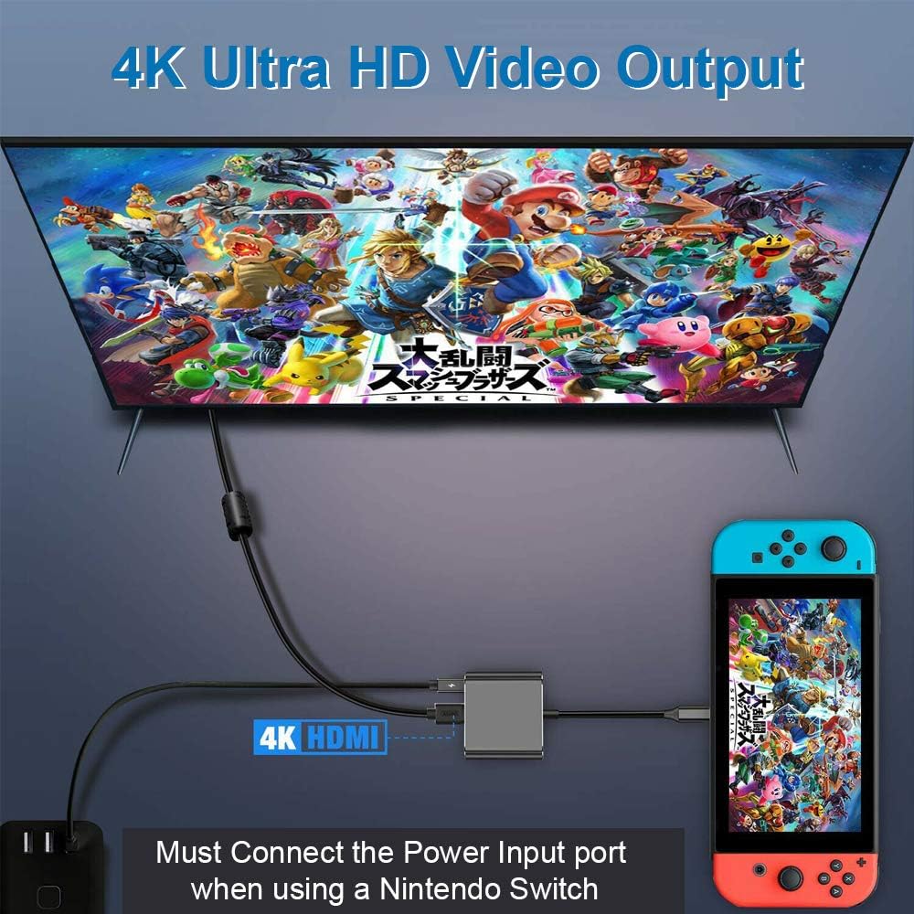 محول متعدد المنافذ 3 في 1 من USB C إلى HDMI عالي الجودة (متوافق مع ثاندربولت 3): تم تصميم هذا النوع C إلى HDMI 4K + منفذ شحن USB C + محول USB 3.0 لتوصيل الأجهزة من النوع C (ماك بوك، جالاكسي نوت 10/9 8، سامسونج جالاكسي S10/+ بلس S9، S8 ميت 30، 20، 10، هواوي P30، P2. سلسلة 0 سلسلة نينتندو سويتش ، ، إلخ) إلى أجهزة اتش دي ام اي، مثل الشاشة وتلفزيون اتش دي وجهاز العرض، مما يوفر شاشة أكبر بدقة عالية 4 كيه × 2 كيه عند 30 هرتز.