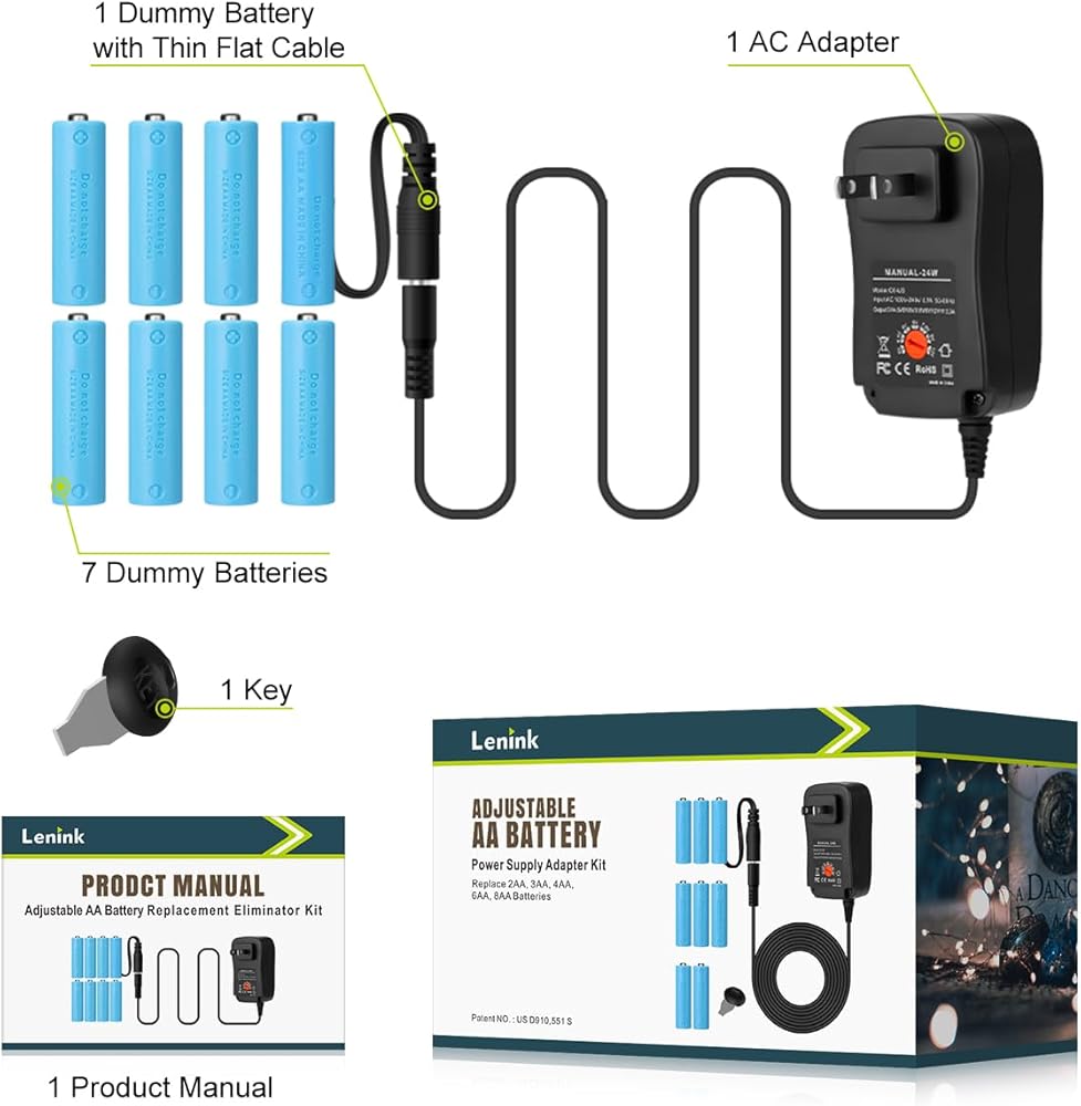 تتضمن الحزمة: 1 محول تيار متردد قابل للتعديل، 8 بطاريات دمية AA، 1 مفتاح. ملحوظة: 1. لا تحاول شحن البطاريات الوهمية AA. 2. غير قادر على تشغيل المعدات الإلكترونية بمفردها، يجب استخدامها مع محول طاقة الحائط. تم تطبيق براءة الاختراع