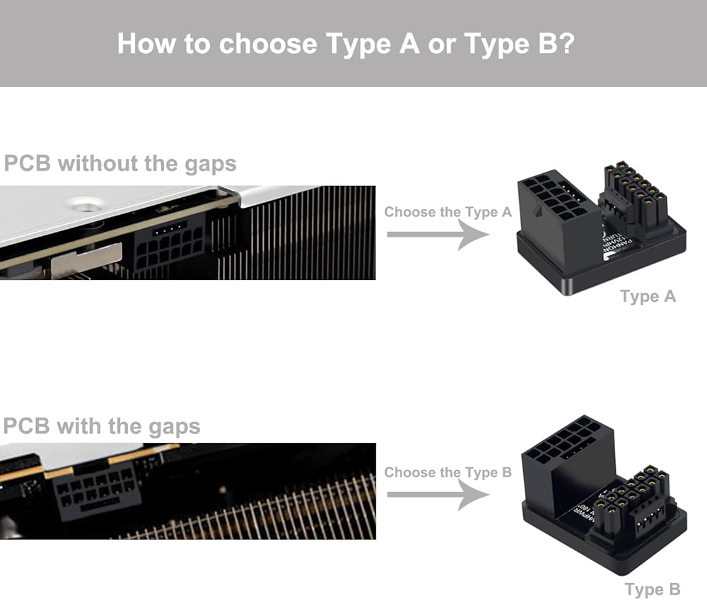『ملاحظة』تم تصميم هذا المحول فقط لبطاقة الرسومات (GPU)، وليس اللوحة الأم أو وحدة المعالجة المركزية. يعمل النوع A مع لوحة PCB بدون فجوة، ويعمل النوع العكسي مع لوحة PCB التي بها فجوة. يرجى التحقق بعناية من اتجاه وحدة معالجة الرسومات الخاصة بك قبل تقديم الطلب.