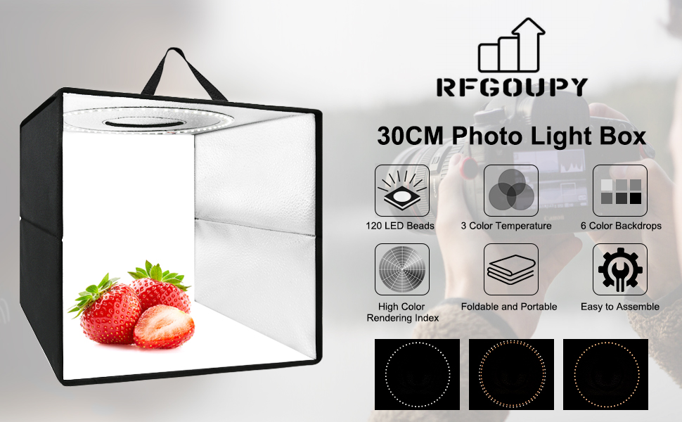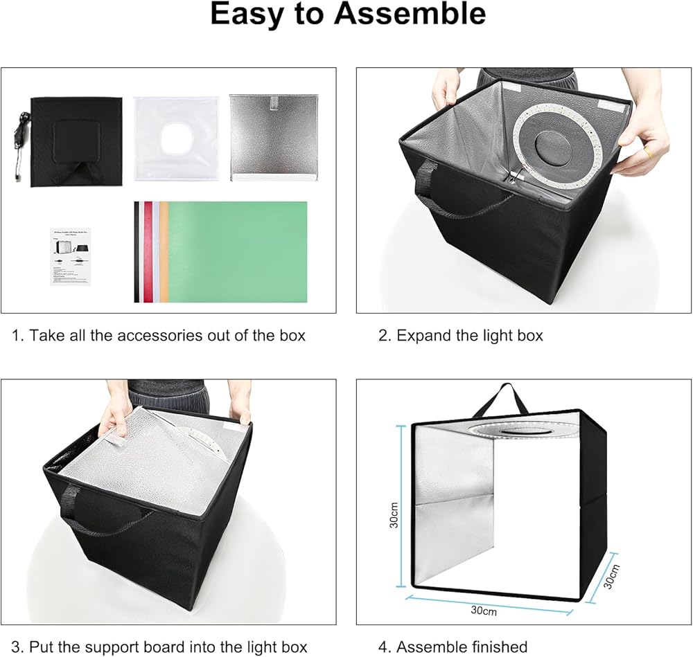 【سهلة التركيب】صندوق الصور ذو تصميم قابل للطي وسهل التركيب جدًا، ولا يحتاج إلى براغي أو أي أدوات، ويمكن تجميعه في ثوانٍ معدودة. يحتوي صندوق إضاءة الصور على حزام مقبض، سهل الحمل، مناسب للاستخدام الداخلي والخارجي. يبلغ حجم صندوق إضاءة التصوير الفوتوغرافي للمنتج 12 × 12 بوصة، وله مجموعة واسعة من الاستخدامات، ومناسب بشكل خاص لتصوير العناصر الصغيرة، مثل المجوهرات ومنتجات التجميل والإلكترونيات والألعاب الصغيرة، إلخ.