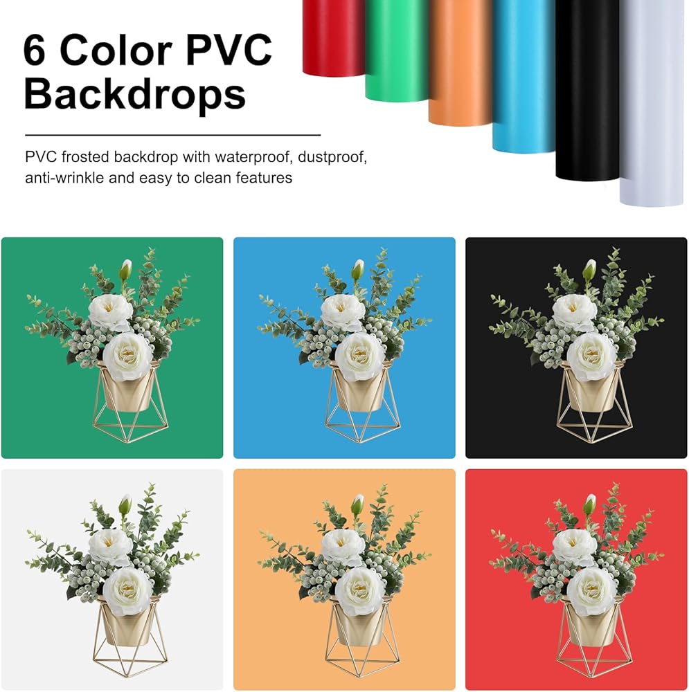 【خلفية من البولي فينيل كلوريد بـ 6 ألوان】يأتي الصندوق المضيء لتصوير المنتج مع 6 خلفيات ملونة مختلفة (أخضر/أزرق/أسود/أبيض/برتقالي/أحمر). الخلفية مصنوعة من مادة PVC، وهي مقاومة للماء والغبار والتجاعيد وسهلة التنظيف. يمكنك بسهولة تبديل ألوان الخلفية المختلفة وفقًا لاحتياجات مشهد التصوير.