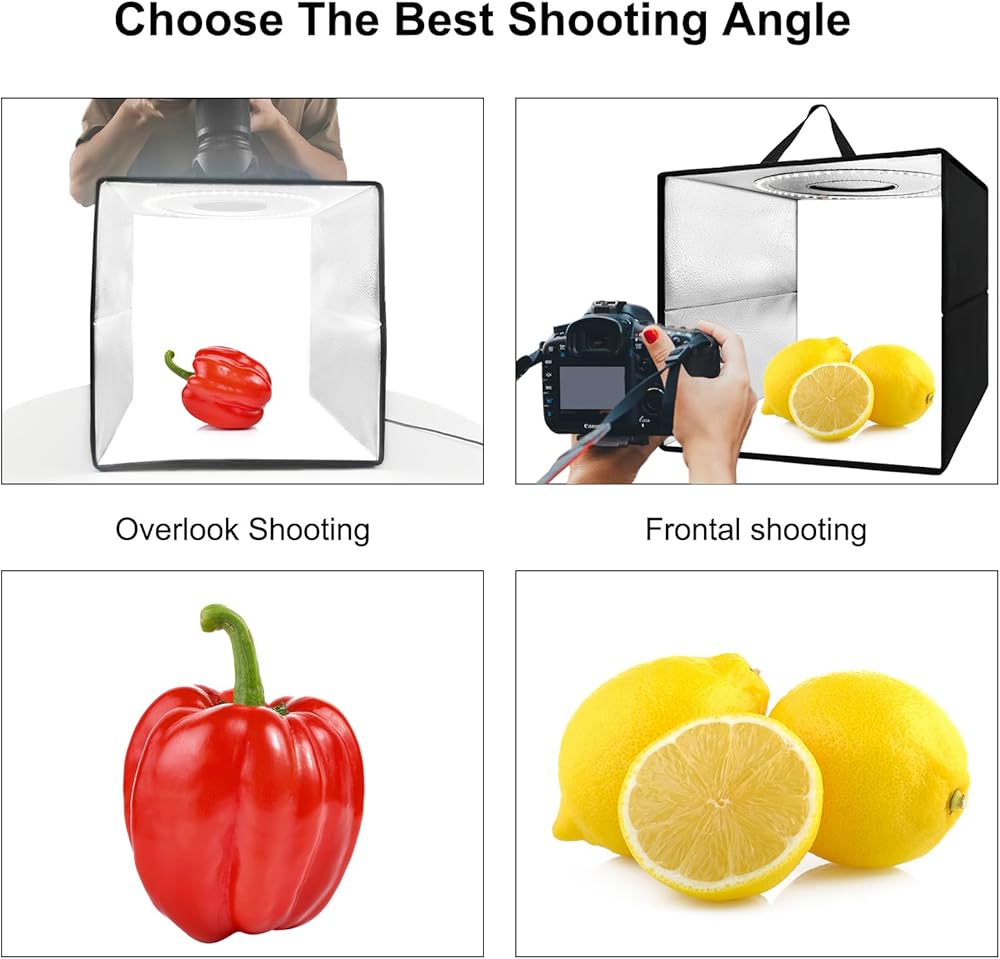 【تصوير متعدد الزوايا】بالإضافة إلى نافذة التصوير الأفقية الأمامية، يحتوي صندوق الصور على نافذة تصوير عمودية في الأعلى، مما يسمح لك بالتقاط تفاصيل المنتج من زوايا مختلفة والتقاط تأثيرات بصرية مختلفة. رائعة لمصوري المنتجات والبائعين عبر الإنترنت ومشغلي الأعمال الصغيرة.