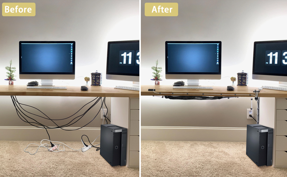 [ إخفاء الكابلات] توفر شبكة الكابل الموجودة أسفل الطاولة مساحة كافية لتخزين جميع الطاقة أو الكابلات. قل وداعًا للأسلاك أو الأسلاك أو الكابلات الجامحة والفوضوية للحفاظ على نظامك تحت المكتب.