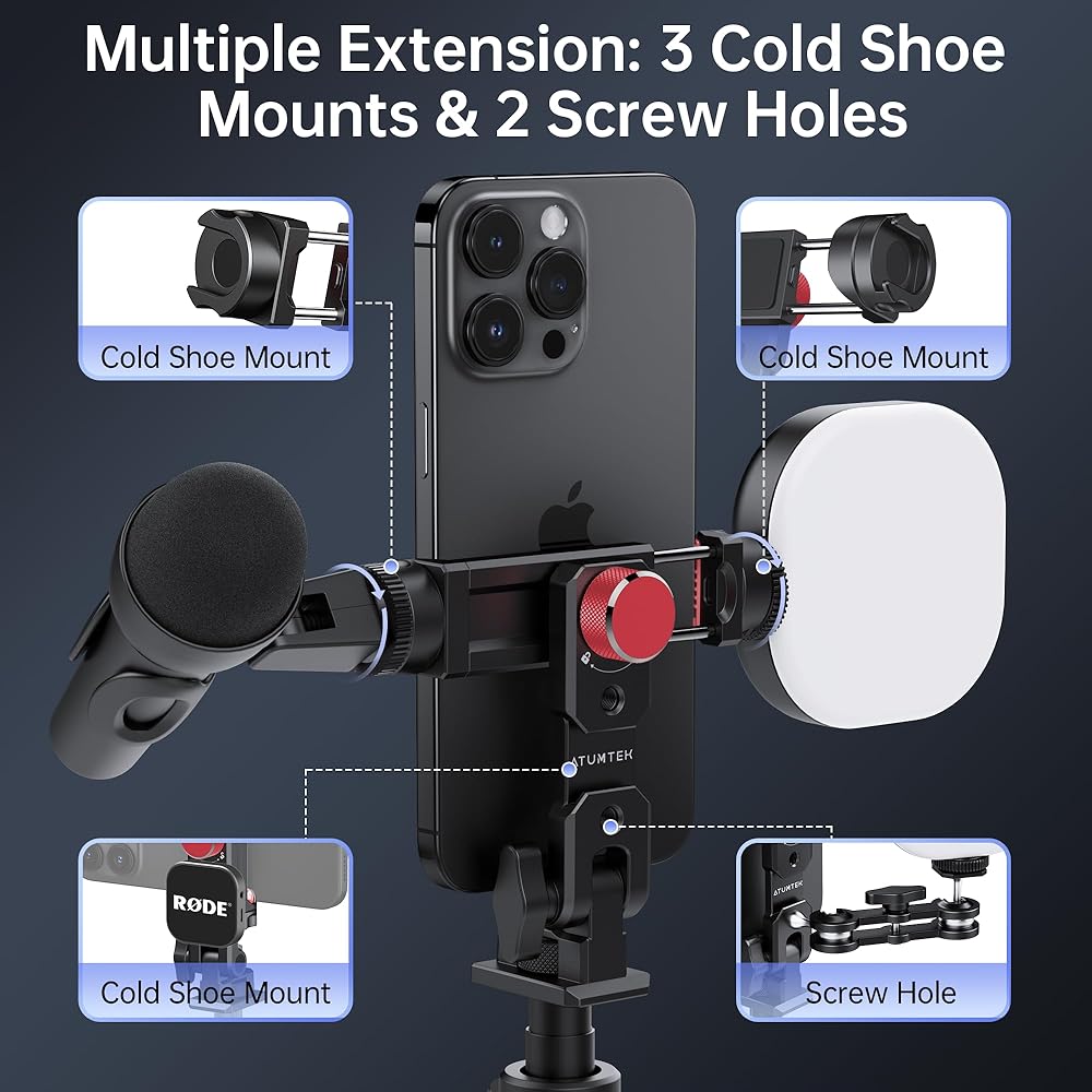 حامل ثلاثي القوائم للهاتف المعدني من ATUMTEK، محول تثبيت للهواتف الذكية من الألومنيوم العالمي مع 3 أحذية باردة، حامل برغي 3 1/4 بوصة، منفذ Arca ومحول حذاء بارد قابل للتحويل، دوران 360 درجة وزاوية إمالة 145 درجة