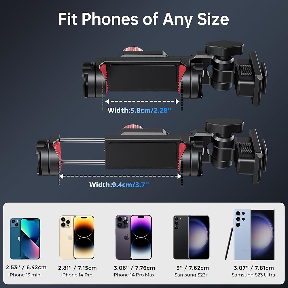 [توافق عالمي للهاتف] يناسب المشبك الهواتف التي يتراوح عرضها من 5.8 سم/2.28 بوصة إلى 9.4 سم/3.7 بوصة. يتوافق حامل الهاتف ثلاثي القوائم هذا مع مجموعة واسعة من الموديلات، بما في ذلك iPhone 14/14 Pro/14 Pro Max/13/13 Pro/13 Pro Max/12/12 Pro/12 Pro Max/11/11 Pro/11 Pro Max /X/XS/XR/XS Max/8/7 وSamsung Galaxy S23/S23 Plus/S23 Ultra وHuawei وGoogle Pixel والمزيد. يرجى ملاحظة ما يلي: لا يتم تضمين الحوامل الثلاثية والميكروفونات ومصابيح LED والملحقات الأخرى.