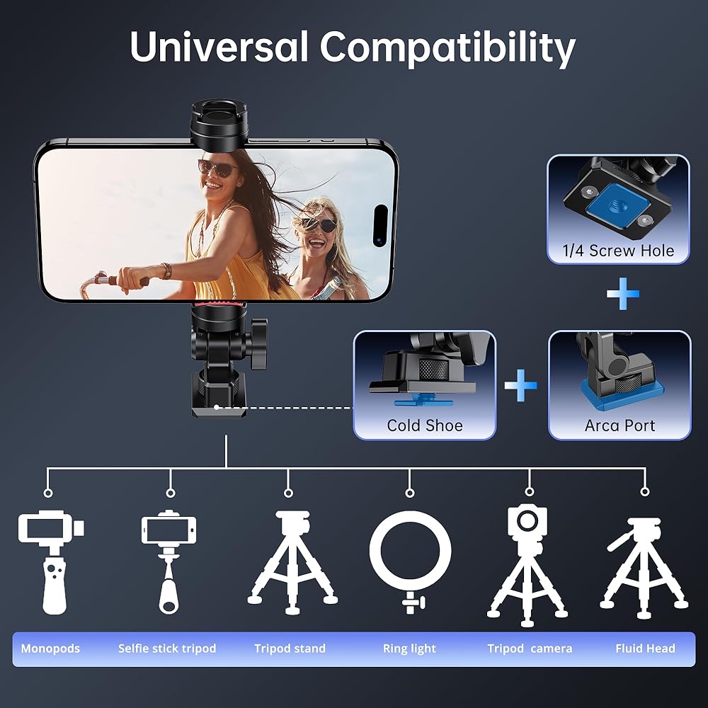 [متوافق مع Arca Mount] يوفر حامل الهاتف ثلاثي القوائم الخاص بنا خيارات تركيب متعددة الاستخدامات. الطريقة الأولى: يسمح تصميم Arca سريع التحرير بالاتصال المباشر برأس كروي مقاس 38 مم. الطريقة 2: يتميز محول تثبيت الهاتف بمحول الحذاء البارد القابل للتحويل في الجزء السفلي من منفذ Arca، والذي يمكن تثبيته بشكل آمن على الكاميرا. الطريقة الثالثة: فتحة لولبية مقاس 1/4 بوصة في الأسفل تتيح سهولة التركيب على الحوامل الثلاثية.