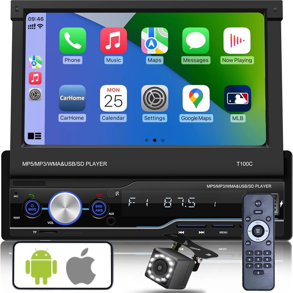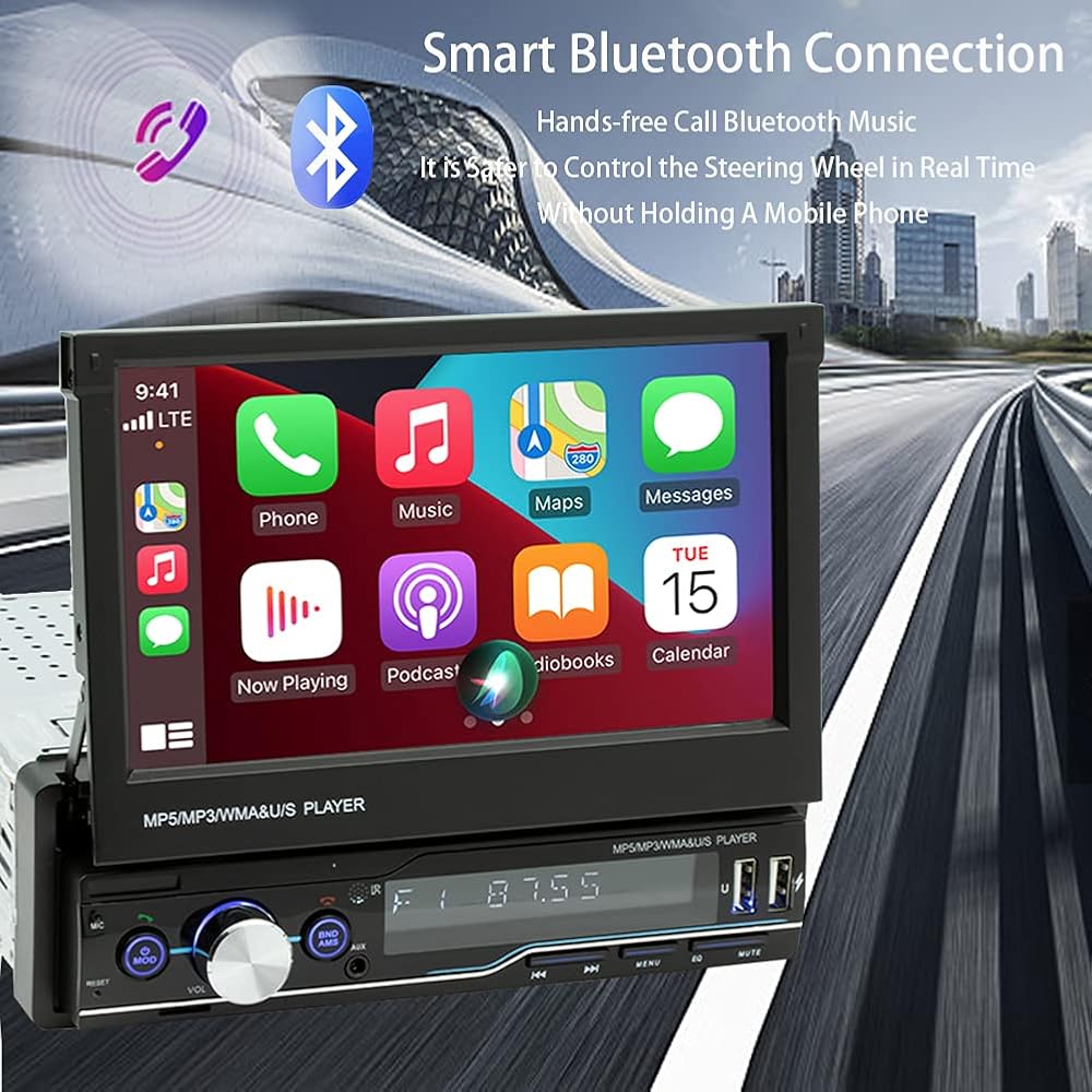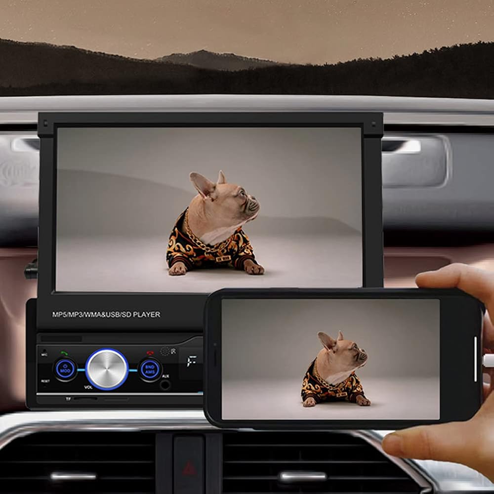 ستيريو سيارة دين واحد مع شاشة لمس ستيريو منبثقة للسيارة مقاس 7 انش، متوافق مع ابل كار بلاي واندرويد اوتو وميرور لينك. بلوتوث 5.0، راديو اف ام.